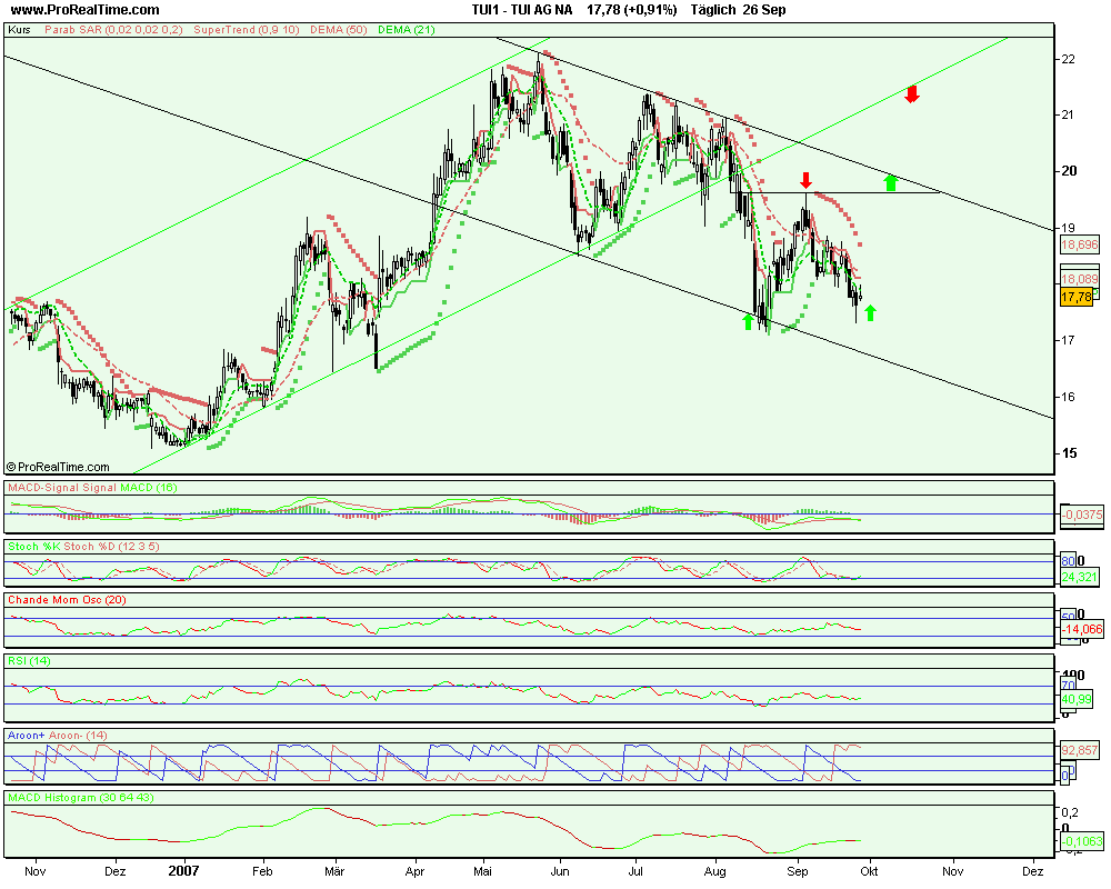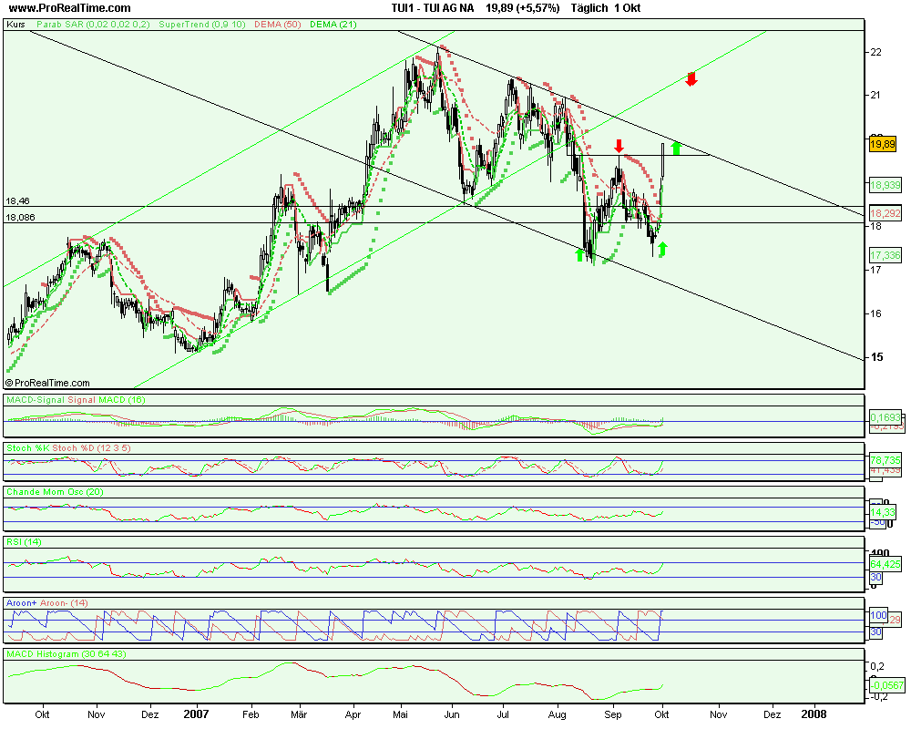 Wir würden Aktien der TUI AG bis max. 19,00 € kaufen. Setzen sie sich einen Stopkurs bei 18,00 €. Unser erstes Kursziel liegt bei vorerst 21,00 €.