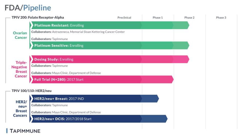 Fast forward to today and we’ve seen practically nothing from the company that could get markets excited. TapImmune goes for $3.05 and commands a market capitalization of just $32 million. For a company that counts AstraZeneca plc (ADR) (NYSE:AZN) among its commercial collaborators and that has two (soon to be three) mid stage oncology assets in development alongside entities like Memorial Sloan, Mayo Clinic and the Department of Defense, this seems like a crazy undervaluation as compared to peers in a similar (or worse) situation.