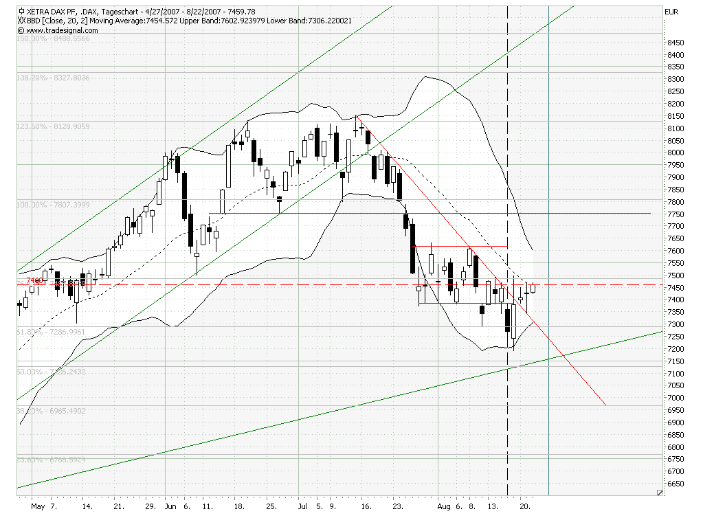 Jetzt haben wir DAXi, im Tageschart und Stundenchart ist er erstmal über der Mittellinie des BBD. Sollte diese doch als Unterstützung herauskristalisieren, wird er zum oberen Band laufen. Dann können wir uns auf 7580 Punkten freuen. Vorausgesetzt der Dow macht mit.