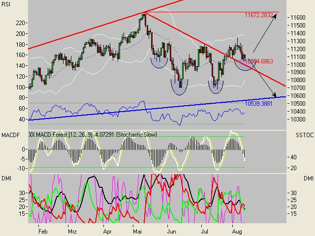 Bislang konnte die rote Linie im Daily nicht nachhaltig überschritten werden, außerdem halten sich die Candels zwischen den 2 Bollinger Bands Mittellinien auf, mittelfristig ist dies als neutral zuwerten. Ein break einer dieser Linien ist als Kauf- bzw. Verkaufssingal zusehen. Die kurzfristigen Indis haben noch etwas Platz (mit kurzfr. bezeichne ich 2 - 5 Tage) die mittelfristigen(1 - 2 Wochen) sind am eindrehen. Es scheint sich eine Abschlussformation in Form eines symetrischen Dreiecks - dies könnte aber auch eine Fortsetzung sein, allg. bleibt festzuhalten, dass der große Fibotrend seit low 2003 erstmal Stand gehalten hat, solange er dies tut ist die langfristige Situation klar bullish!