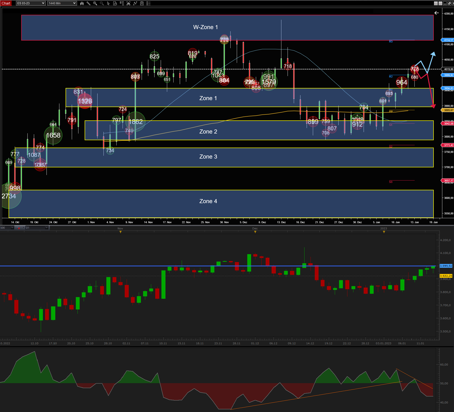 Rückblick Analyse KW 02: Der ES-Future konnte sich mit dem Aufwärtspotenzial in der letzten Handelswoche behaupten und hat erfolgreich im zweiten Kursanlauf die obere Begrenzung der Seitwärtsphase/W-Zone 1 hinter sich gelassen. Aufgrund positiver Wirtschaftsdaten wurden Kurnotierung über der psychologischen Widerstandsmarke von 4000 Punkten auf Wochenschlusskursbasis erreicht.