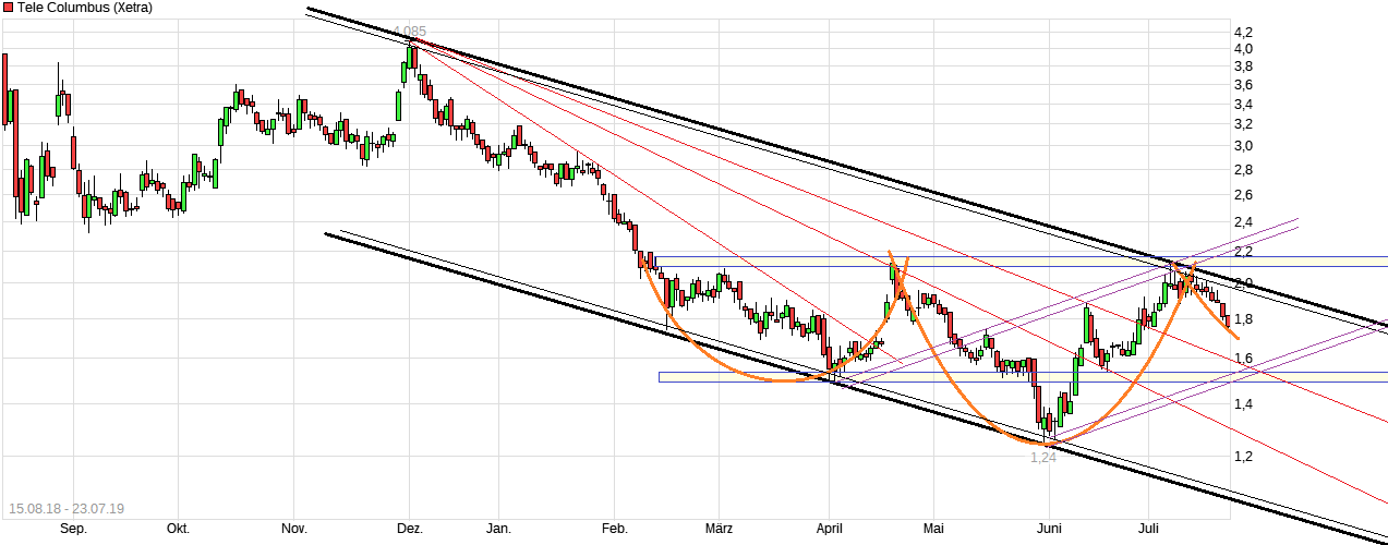 oder haben sich alle Seiten hinreichend mit Munition (Stimmrechten) versorgt? Dommermuth hat offenbar nun doch eingewilligt nicht den dominaten Ego-Trip zu fahren ( www.wiwo.de/...mbus-sprechen-wieder-miteinander/24530024.html "05. Juli 2019 .. United Internet und Tele Columbus sprechen wieder miteinander...Im Streit über die Besetzung des Aufsichtsrats bei Tele Columbus scheint es eine Annährung gegeben zu haben. ..") . Entsprechend sind "Gegner" wie Alatus seit einiger Zeit nicht mehr gezwungen aufzustocken (was anfangs ja noch passierte =>Tele-Columbus-Investor greift United Internet an - www.finance-magazin.de/wirtschaft/...ted-internet-an-2040631/ ). Somit fällt diese Sondernachfrage seit einiger Zeit wieder aus. Entsprechend ist der Chart wieder im Konso-Modus. Denkbar wäre z.B. man fällt zurück in die Region um die 1,55/60, um z.B. ein potenzielle rechte inverse Schulter damit im Anschluß zu kreieren. Allerdings muß dann auch endlich mal wieder mehr an fundamental positiven Dingen irgendwann passieren anstatt nur AR-Köpfe auszutauschen, um hier den Kopf etwas länger aus der Schlinge zu ziehen. Sonst fehlt einfach der Treibstoff, um aus dem Tal der Tränen zu kommen und es wird dann länger beim zähen Seitwärtsgezucke im 1,xx Bereich bleiben.