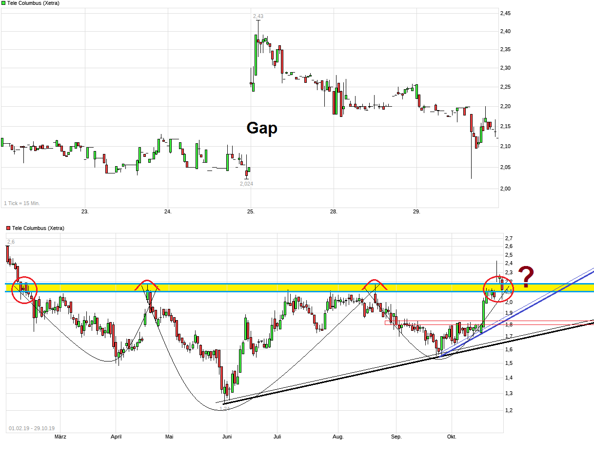 Wichtige Entscheidung steht jetzt zumindest im Chart kurzfristig an: Geht man nach dem Gap-Close wieder hoch und das Ganze war auch nochmal eine Art Pullback heute an die horizontale Widerstandszone 2,10/20 ( und es könnte sich vielleicht dann auch eine Art inverese SKS nun ausbilden) oder wird diese Zone doch nicht nachhaltig jetzt rausgenommen und das zweitägige Strohfeuer verpufft leider schnell wieder, weil ohne die kommenden Quartalszahlen nicht genug Leute sich schon vorher zu weit aus dem Fenster lehnen wollen? Auch da kann man aktuell nur sagen: warten wir es ab. Wäre natürlich nicht schlecht, wenn hier mal klare Signale entstehen würden, daß eine Bodenbildung stattgefunden hat.