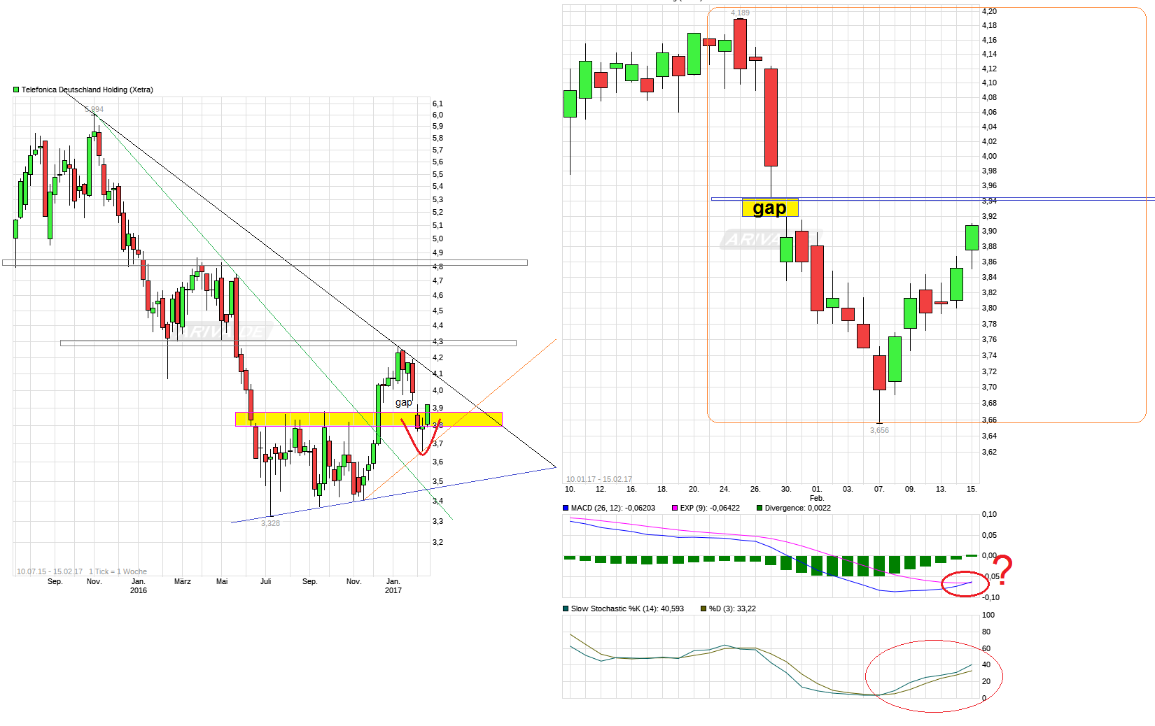 plus positiver Überraschung, da sich immer weiter zeigt, wie die Fusionssynergien über die Jahren deutlich größer werden und sogar ab 2019 nochmal 100 Mio höher werden als bislang gedacht. Wer hier bei Telefonica Deutschland investiert ist, der sollte in erster Linie im Auge haben, was die Fusion mit e+ künftig bringt und was die Divi dabei macht. Und auch zu Letzterem ist die Aussage besser als zuvor. Bisher hat man gesagt, daß die nun kommende Divi 25 Cent betragen soll und die kommenden Jahre mindestens so hoch bleiben wird. Jetzt sagt man sogar, daß die nächsten Jahre die Divi von Jahr zu Jahr weiter steigen wird und nicht nur mindestens gleich bleibt. Wer sich etwas mit den Mobilfunksektor in Deutschland ernsthaft beschäftigt ist von den Aussagen zum Tagesgeschäft nicht überrascht. Das entspricht dem was zu erwarten war. Durch gewisse bekannte Regulierungsmaßnahmen und auch durch etwas sinkende Hardwareverkäufe geht der Umsatz leicht zurück. Aber das ist ein Wegfall von margenarmen Umsatz. Besonders an Hardware verdient man auch eigentlich so gut wie nichts. Entsprechend bleibt also die operative Ertragsseite weiter solide bzw. wird besser von Jahr zu Jahr, da man durch Kostenersparnisse / Synergieeffekte andere entgegenwirkende Entwicklungen stetig überkompensieren wird die die kommenden Jahre. Wer also Wert auf stetig gute Divis legt und eher etwas Konservatives sucht, der ist mit der Aktie im aktuellen Kursbereich noch immer gut aufgehoben, wenn man bedenkt, daß man in den kommenden knapp 40 Monaten über 75 Cent als Divi zurückbekommt. Was eine interessante Frage wäre, daß ist wie die Mutter in Spanien mit ihrem noch immer dominaten Anteil auf Dauer umgehen wird. Würden sie diese Aktien mal klarer reduzieren wollen (z.B. außerbörsliche Pakete an diverse instit. Investoren) und damit der Streubesitz klar gesteigert, dann wäre Telefonica Deutschland sogar dadurch ein potenzieller DAX Kandidat angesichts der ohnehin schon hohen Marktkapitalisierung, wo aber bislang der entscheidente Freefloat noch zu niedrig ist. Käme es zu einem DAX Aufstieg, dann müßten angesichts der enormen Massen an passiven Produkten auf den DAX massiv Material gekauft werden und würde den Kurs damit erstmal für eine Weile eine "Sonderkonjunktur" geben. Aber das sind ungelegte Eier. Für mich wäre ein Kursanstieg bis in den Bereich von ca. 4,40 bis zur HV durchaus vorstellbar solange sich nicht der Gesamtmarkt für einen größeren Umschwung nach unten vorher entscheiden sollte anstatt weiter stückenweise anzuziehen.