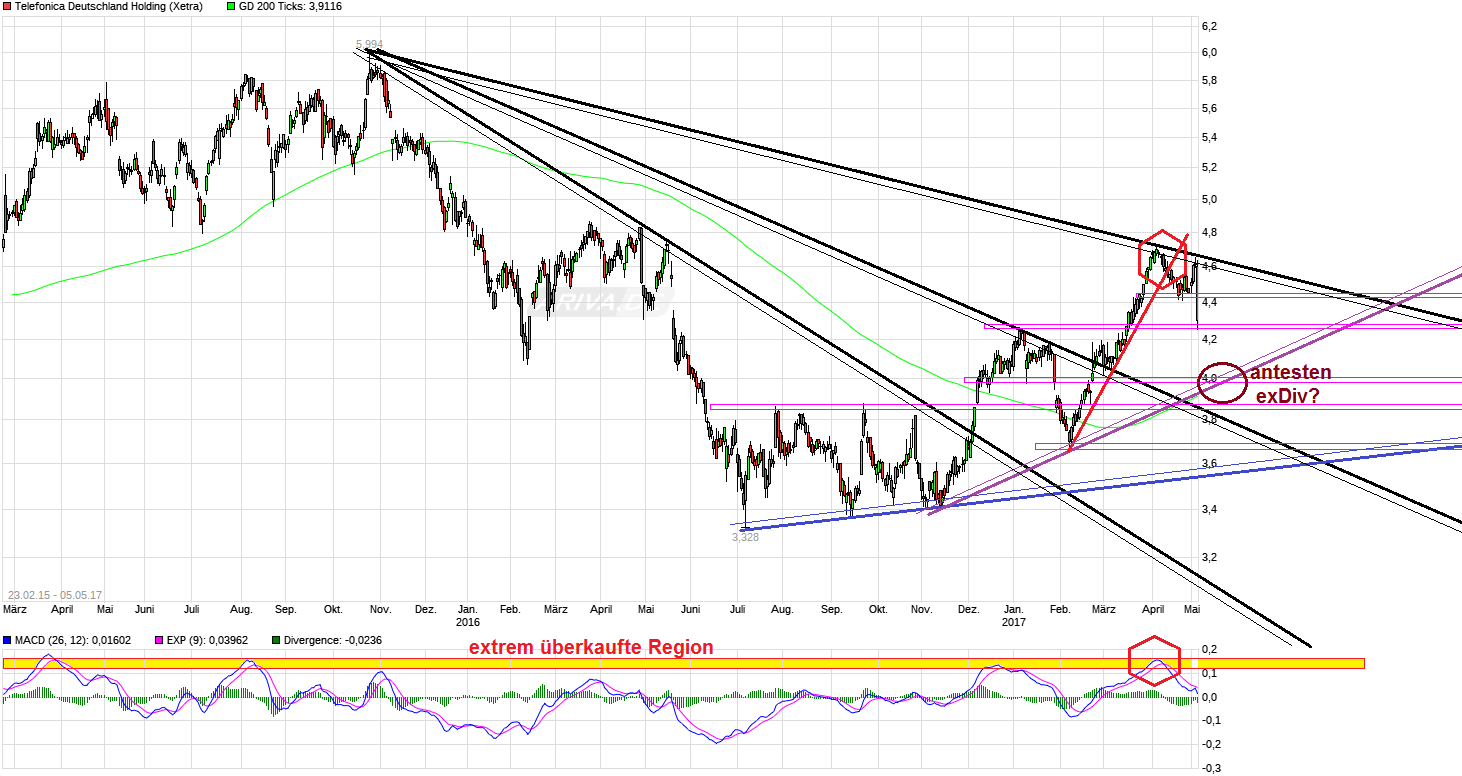 Habe heute die Chance genutzt für einen ersten (Teil-) Wiedereinstieg unter 4,30, weil ich die ersten Reaktionen auf die Q.1 Zahlen für etwas zu übertrieben halte. Ist wohl eher noch Teil der technischen "Abkühlung" nach der vorhergehenden Überhitzung. Hatte ja im Bereich um 4,60 in zwei Hälften den Altbestand vor einiger Zeit verkauft, da ich den Wert schon da für extrem überkauft gehalten hatte und mit einer baldigen nennenswerten Konso gerechnet hatte, sobald der extrem steile kurzfristige Trend bricht. Was für den Wert noch immer spricht, daß ist weiterhin die sehr starke DiviRendite. Nächste Woche gibt es 25 Cent und in einem Jahr 25 Cent+X. Wegen des weiterhin guten Wachstums des Free Cashflows (der im Q.1 wieder gut war), sollten die Divis die nächsten Jahre tendenziell weiter steigen auf 26-27 Cent. (O-Ton: ".. Gesamtjahresausblick wird bestätigt; starke Cashflow-Dynamik stützt das mittelfristige Dividendenwachstum sowie den Dividendenvorschlag von 0,25 EUR/Aktie für die Hauptversammlung am 9. Mai 2017.."). Also in den kommenden etwas über 12 Monaten (2 HVs) bekommt man somit über 50 Cent an Divi ausgeschüttet. Macht bei einem Kurs von z.Z. knapp unter 4,30 ein Rendite von ca. 12%. Damit kann ich leben. Stünde der Kurs im Sommer 2018 bei ca. 3,75/80 , dann wäre man durch die Divis in der Summe noch immer nicht wirklich im roten Bereich. Ich erwarte aber, daß man die nächsten Jahre doch mehr im Bereich 4+x stehen wird als im 3+x Bereich, da die Fusionssynergien stetig weiter steigen (zuletzt Prognose weiter angehoben worden auf 900 Mio bis 2019) und der Preiswettbewerb (nach Verschwinden von E+ und der Rolle rückwärts bei der zuvor preisaggressiven Drillisch) weiter an Dynamik verliert (=> O-Ton : "... O2 Free verzeichnet solide Entwicklung; weitere Anzeichen für nachlassenden Wettbewerbsdruck im Non-Premium-Segment; bereinigter MSR zeigt weitere sequentielle Verbesserung im Jahresvergleich..."), während gleichzeitig die Datenmenge die pro Vertrag zugebucht wird stetig weiter steigt durch die verstärkte Nutzung datenzehrender mobiler Dienste. (=> O-Ton : "..Die Datennutzung bei LTE-Kunden im O2 Postpaid-Privatkundengeschäft profitierte weiterhin von der Nachfrage nach Musik- und Video-Streamingdiensten und wuchs im Vergleich zum Vorquartal um 9% auf 1,8 GB pro Monat, einem Plus von 52% im Jahresvergleich..."). Die Auswirkungen der jüngsten deutlichen Preiserhöhungen von Drillisch (= großer Konkurrent speziell für O2 Netz-Verträge) werden sich erst ab Q.2/17 dann langsam zeigen. Daher sollte man Q.1 auch nicht überbewerten. Die regulatorischen Dinge die einmalig den Umsatz in 2017 belasten sind 2018 dann nicht mehr zusätzlich drückend, d.h. der 2018er Umsatz bzw. dessen Entwicklung gegenüber dem Vorjahr wird dann wieder "normaler" aussehen. Wer also nicht einen Wert sucht der sich kursmäßig nun zwingend schnell verdoppeln soll, sondern eher eine konservative Beimischung für sein Depot sucht, mit gleichzeitig hervorragender DiviRendite (die hier auch weiter sehr sicher sein sollte die nächsten Jahre), der wäre mit dem Wert gut bedient, wenn man Rücksetzer zum Kauf nutzt. Könnte, bedingt durch den DiviAbschlag von 25 Cent nach der HV und etwas weiterer Konso, durchaus auch nochmal unter die 4€ Marke schauen. Würde das für einen weiteren Teilkauf nutzen, wenn es denn so käme. Natürlich könnte ein allgemeiner größerer Einbruch an der Börse auch den Wert belasten. Aber das ist ein Risiko was alle Aktien haben und weniger ein individuelles Risiko ist. Wobei natürlich auch nie ausgeschlossen werden kann, daß auch hier mal etwas an unerwarteten Bad News kommen könnte. Das wäre aber dann wohl mehr etwas branchenspezifisches, daß alle Telko/ProviderWerte beträfe.