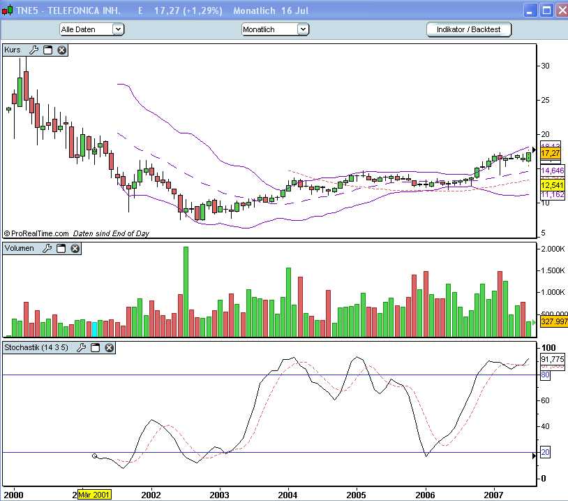 Rückblick: Die TELEFONICA Aktie markierte im März 2000 ihr Allzeithoch bei 30,67 Euro. Von dort aus fiel die Aktie bis Oktober 2002 auf ein Tief bei 7,26 Euro ab. Dieses Tief war Ausgangspunkt einer Rallye, welche die Aktie zunächst auf ein Hoch bei 14,58 Euro im Februar 2005 führte. Nach einer Korrektur bis 11,83 Euro zog die Aktie ab Mai 2006 wieder deutlich an. Am 19.02.2007 erreichte die Aktie ein Hoch bei 17,33 Euro. Seit diesem Hoch konsolidiert die Aktie.