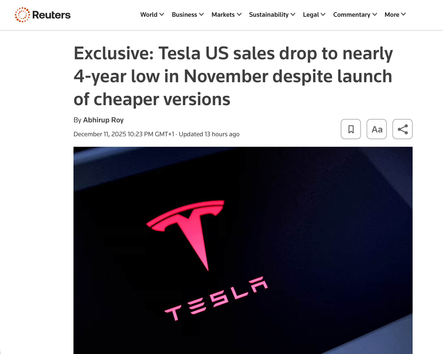 Exklusiv: Tesla-Verkäufe in den USA fallen im November trotz Einführung günstigerer Modelle auf fast