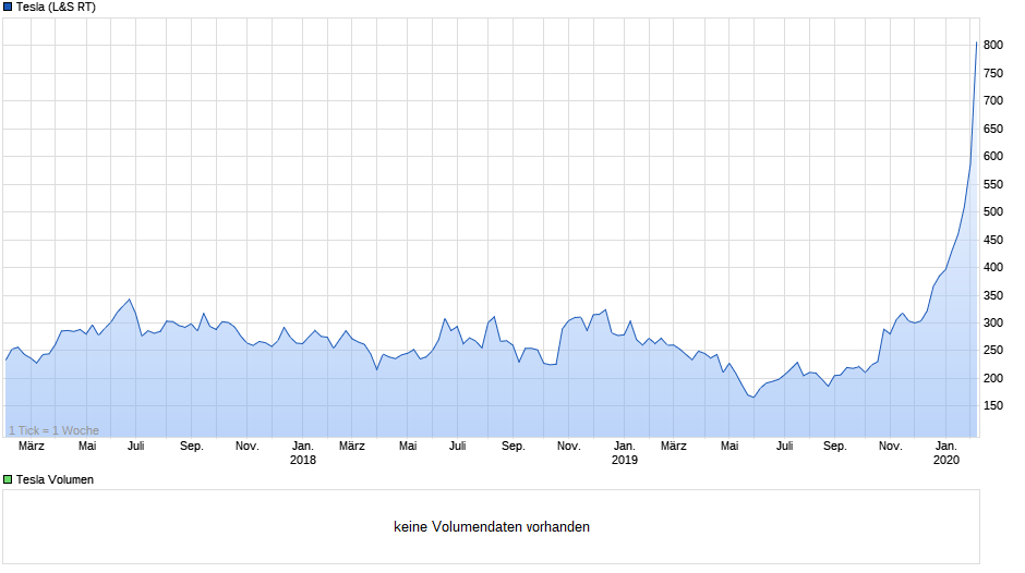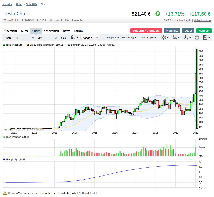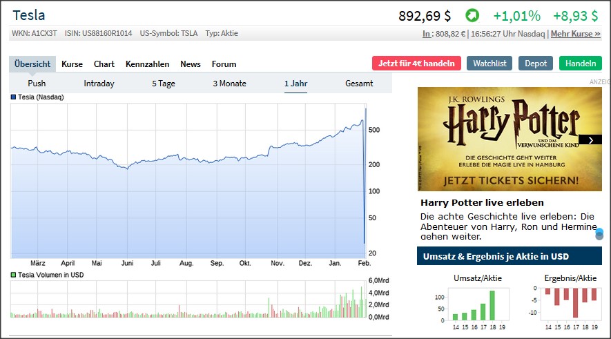 Wer daran wirklich glaubt, dass dieser Kurs gerechtfertigt ist, muss Tesla einiges zutrauen. 20 Dollar Gewinn pro Aktie in 5-10 Jahren zum Beispiel. Selten haben sich Pioniere in einer Branche am Ende auch als Marktführer durchgesetzt. Vielleicht ist es diesmal anders und Tesla wird wirklich bald VW und Co die Rücklichter zeigen. Wer weiß das schon..ich glaube einfach, dass hier viele nur blind mitzocken weil die Gier mal wieder über die Vernunft siegt. Wir werden sehen, wer am Ende das Lachen hat. Ich kaufe lieber immer weiter den Nasdaq 100. dann profitiere Ich auch von Teslass momentaner Erfolgsstory. Wenn der Kurs einbricht, kann ich es ebenfalls gelassen nehmen ;)