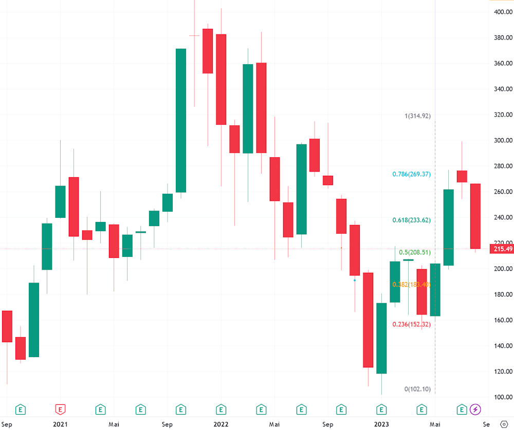 Anhang die vergangenen 36 Monatskerzen TSLA USD. Just Sideways. Die 300 waren Kaufkurs nur für Süchtige, die weder Charts, noch Fundamentaldaten anschauen - meine Meinung. Logisch ging's wieder runter.