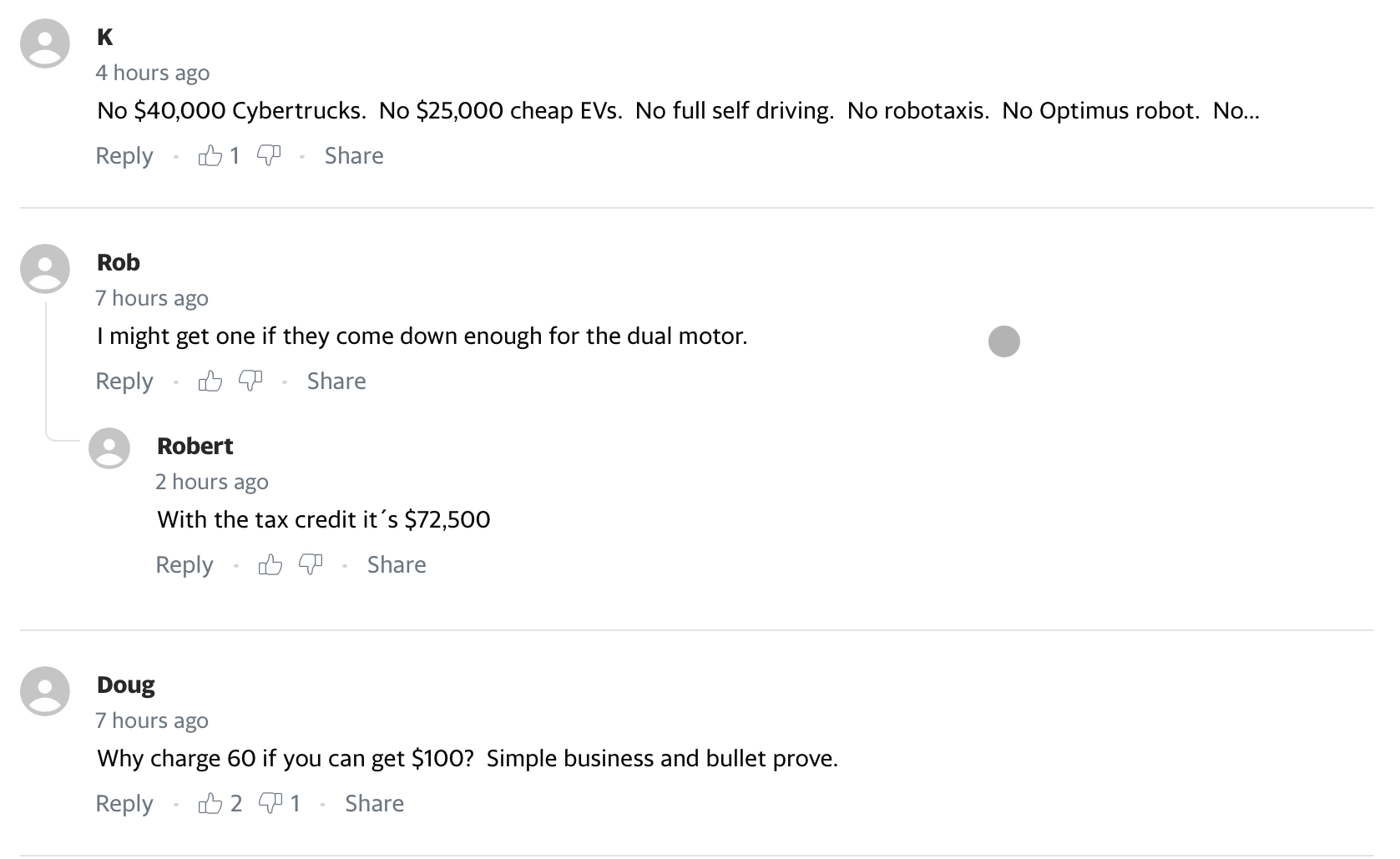 Noch im Oktober sagte Musk, Tesla habe 1 Million Reservierungen für den Lkw. Einige Kunden haben angedeutet, dass sie auf günstigere Versionen warten, weil die Preise höher und die Reichweiten geringer sind als ursprünglich prognostiziert.
