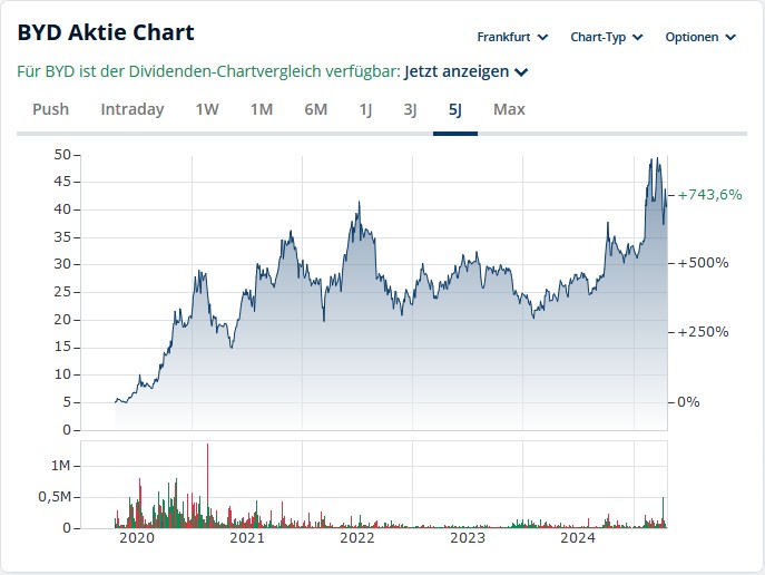 Für mich bleibt bei den reinen Elektroautoanbietern BYD "die Benchmark". Zahlt seit Jahren(!) Dividende wächst und gedeiht (trotz der merkwürdigen "kommunistischen" Regierung als Mühlstein am Hals), lebt mehr von Lieferungen als von Ankündigungen(!) und der Kurs ist auch mittelschwer OK und die Bewertung beinahe nachvollziehbar (0 < KGV < 20 seit längerer Zeit) (OK, deren Ziele für den deutschen Markt sind "optimistisch", aber das kostet bestenfalls ein paar lokale Geschäftsführer:Innen den Job wenn die Realität auch bei denen zuschlägt):
