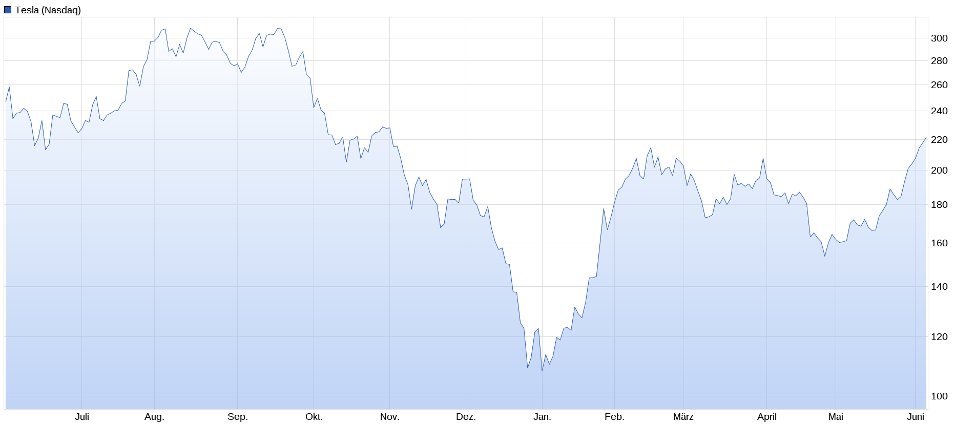 Die Aktien von Tesla feiern derzeit in der Gunst der Anleger ein schwungvolles Comeback. Schon im Mai hatte der Kurs merklich angezogen und letztlich nach einem halben Jahr wieder die 200-Tage-Linie nach oben durchbrochen. Dieser Trend setzt sich nun im Juni eindrucksvoll fort: Bis zu 50 Prozent haben die Papiere seit Ende April schon zugelegt. Am Mittwoch fielen sie an der Nasdaq weiter positiv auf: Während der Nasdaq-100-Index unter Gewinnmitnahmen litt, behaupteten sie zuletzt ein Plus von 2,8 Prozent.
