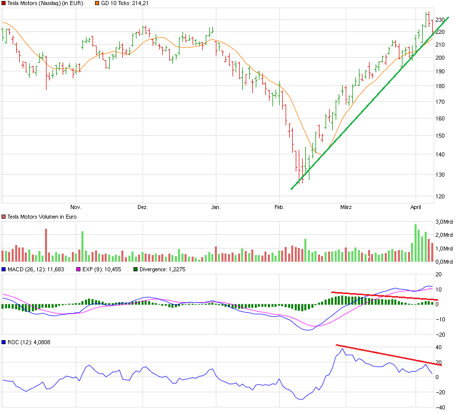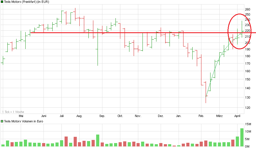 Deine restlichen Striche kannst Du selber reinpinseln, aber hier hast Du den Tesla Chart auf Basis USD. Zeitraum zwei Jahre, jeweils auf Tagesbasis, rote Linie zeigt den 200 Tage Moving Average Verlauf an.