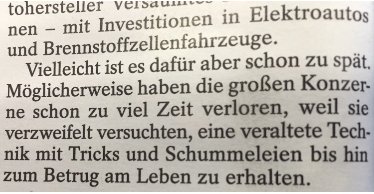 Und das ist auch der Grund, warum die Auto-Dinos lieber am Diesel festhalten, als in E-Mobilität zu investieren - weil die Manager feige Dumpfbacken sind, und Null Risikobereitschaft mitbringen. Lieber investieren sie in ihre verschixxene Autolobby und in die Politiker, als dass sie ein Risiko eingeheb würden.