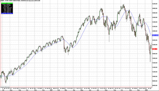 Wahrscheinlich machen die Händler der Société Générale erst einmal Mittagspause (oder hoffen auf eine Gegenbewegung). Der Markt kann sich erholen und bildet eine klare Umkehrformation heraus. Normalerweise müsste der Markt nun einen Teil seiner Verluste wieder ausgleichen, bzw. sich weiter stabilisieren, da immer noch keine Nachrichten zu diesem Vorfall bekannt geworden sind. Alles rätselt. Doch offenbar ist der Verkäufer noch am Markt, es geht bis zum Abend weiter, der Dax fällt ins Bodenlose.