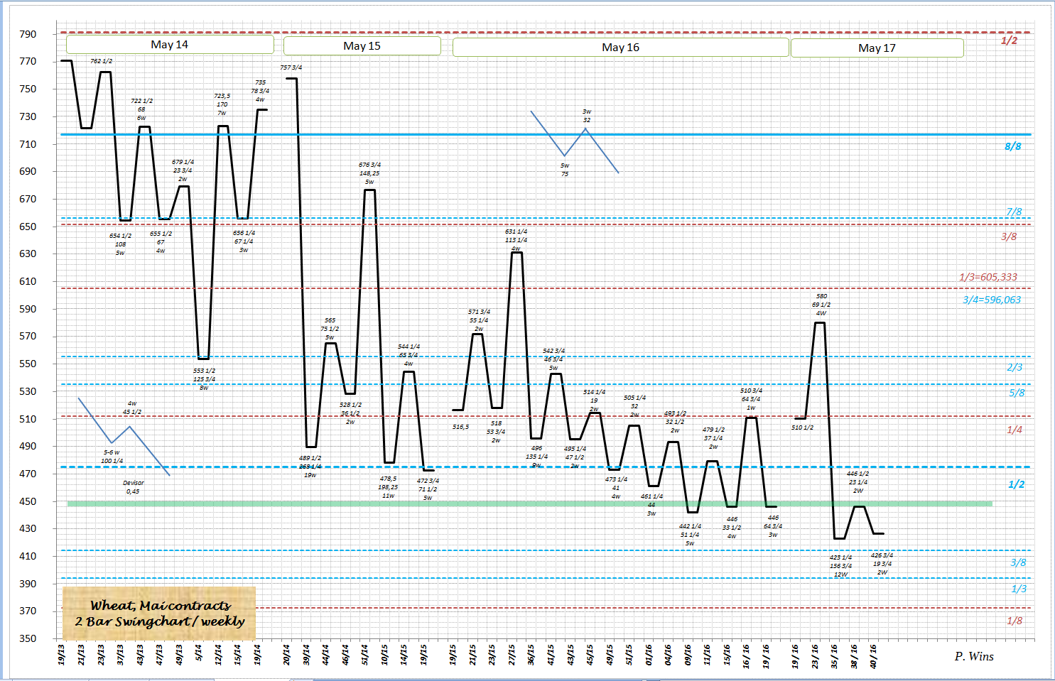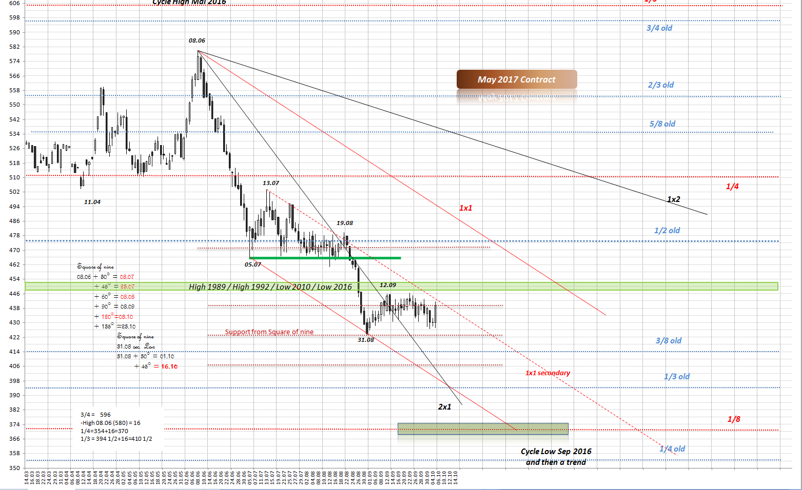 wie ich in #473 geschrieben habe, liegt bei Weizen um den 08.10 herum eine Unterstützung in der Zeit. Ich gebe immer +-2 Tage dazu. Warum? Ganz einfach. Gann'scher "The Master Chart of 360°" ist ein Kreis mit 360°. Gann rechnete pro Tag 1°. Ein Jahr, sind 365 Tage, daher kommt es zur "Verschiebungen"