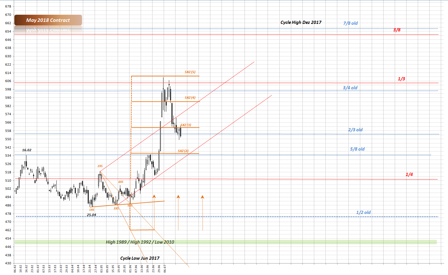 Somit könnte man das als zu schnelle Bewegung von Preis nennen oder Preis ist schneller als die Zeit. Ausgleich, im Fall dass Weizen weiter so entwickelt, bekommen wir im späten Verlauf im Form einer Seitwärtsbewegung
