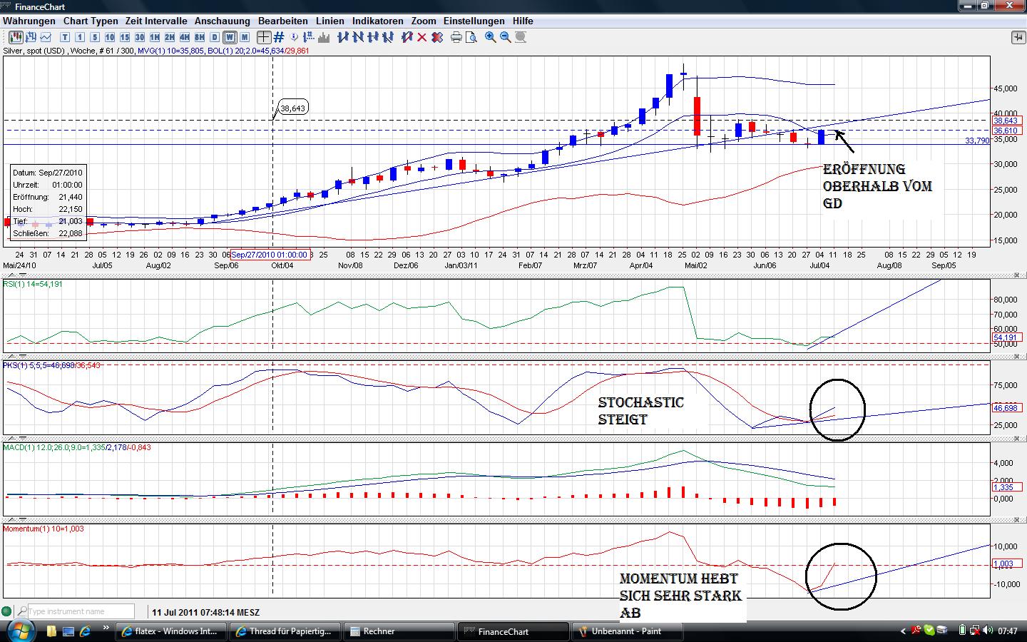 habe mich gerade hier angemeldet, weil ich gerade sehr darüer schockiert war, dass ihr das nch gar nciht beachtet habt, welche Konjunkturdatenin der kommenden Woche auf uns warten. China: Also bei dem plus und den Siberbeständen die die haben, würde ich vorsichtig sein. Bei dem Plus der Wirtschaft??? fraglich, ob da noch sehr viel in Rohstoffe anstatt in Aktien investiert wird. Deutschland: Glaub ich, dass ich jetzt nicht viel dazu sagen muss, denn so lange der Euro noch läuft, läuft auch der DAX! Und bei dem Plus und dem Boom, den wir gerade erleben??? Eine gute Nachriht nach der anderen. und wie man sieht, hat der DAX schon auf die Konjunkturdaten der USA reagiert und schon erste Schwankungen nach oben gemacht. Das heißt: Die kleine Korrektur, die er am Freitag hatte, sollte es jetz bis richtung 7.800 gehen. Würde mich echt wundern wenns nach oben ginge. Und so schlecht waren die Konjunkturdaten jetzt auch wieder nicht, also dürfte es das jetzt schon gewesen sein mit dem leichten Minus der Indizes am Freitag. Ich will nur zum denken anregen, denn ihr wisst ja, was passiert, wenn gute Konjunkturdaten rauskommen. Dann heißts wieder rauf mit Aktien und Rohstoffe werden verkauft. Meines erachtens kann man erst wieder SICHER in Silber, Gold investieren, wenn die chinesische Immobilienblase platzt und das wird innerhalb der nächsten 20 Monate passieren.