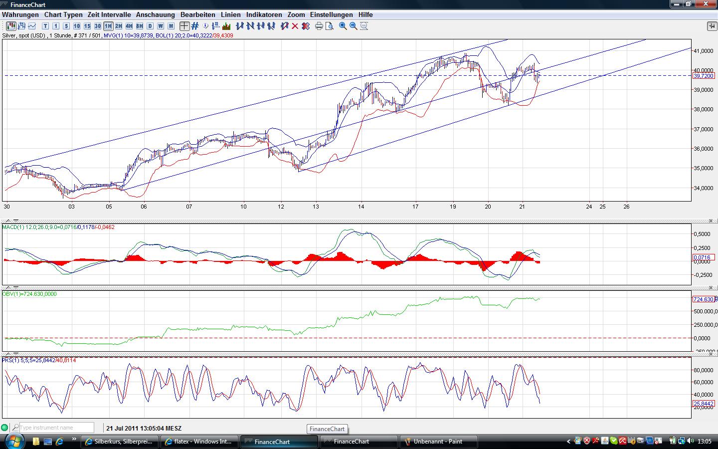 Im 15er wäre die untere trendlinie im Moment bei 38,70$ weiter steigend und die obere Trendlinie bei fast 42$...