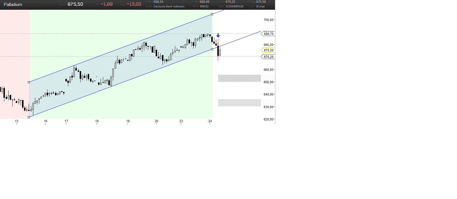 Rückblick: Den Kursverlauf von Gold wollen wir heute im Wochenchart mit linearer Preisskalierung betrachten. Im Unterschied zum logarithmisch skalierten Chart wurde hier die Aufwärtstrendlinie der letzten Jahre mit dem letzten Rücksetzer nicht gebrochen, der Goldpreis prallte daran nach oben hin ab.