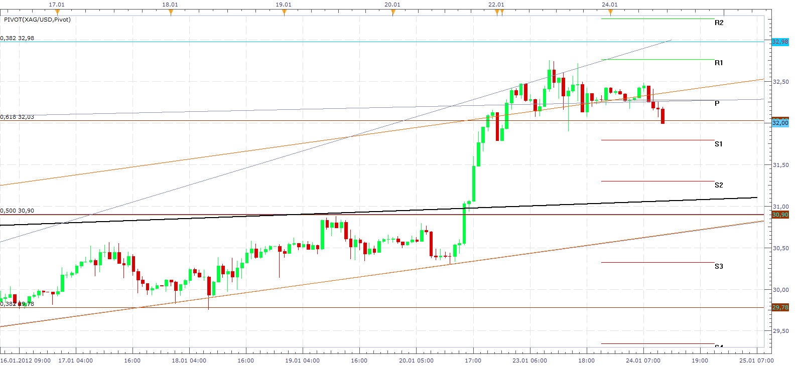 Kursverlauf vom 12.10.2008 bis 24.01.2012 (lineare Kerzendarstellung / 1 Kerze = 1 Woche)