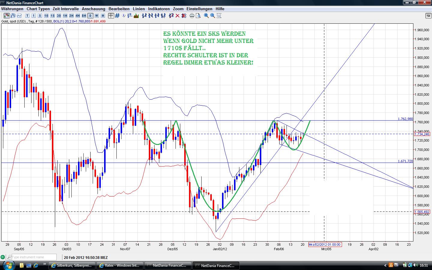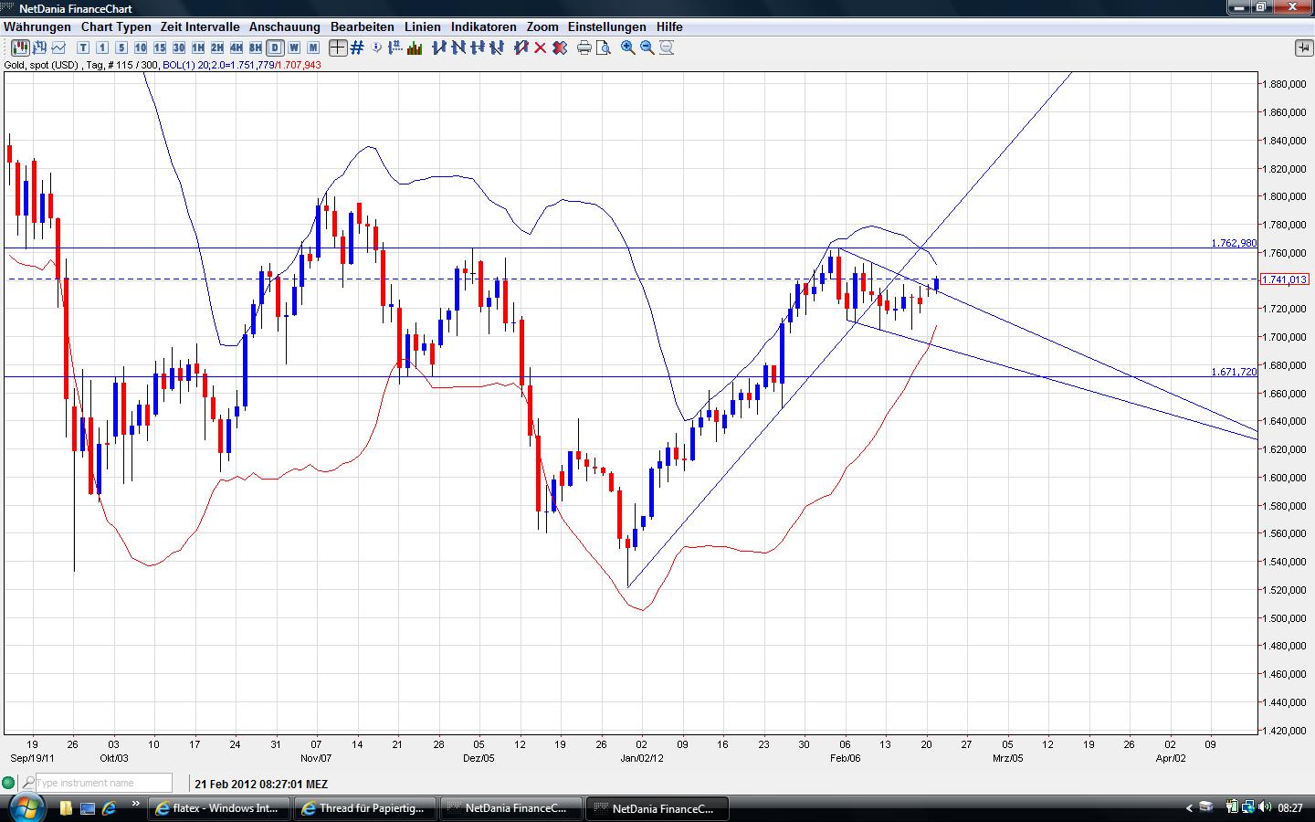 vom Dreieck bei Gold. Sollten wir heute ausbrechen könnte es ein SKS werden und dann wäre ein Anstieg bis erstmal 1763$ möglich.