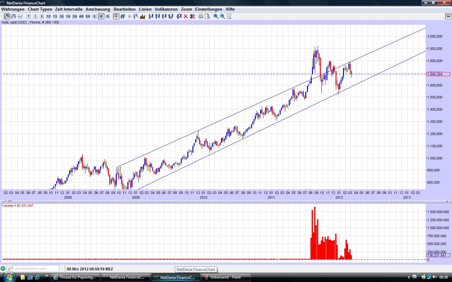 In diesen Chart bei Gold siehst du den ewig andauernden Aufwärtkanal, aber mit noch sehr viel Platz zum unteren Trendrand. Es muss nicht sein, dass wir unten nochmal testen um dann wieder zu steigen, aber die Möglichkeit besteht.