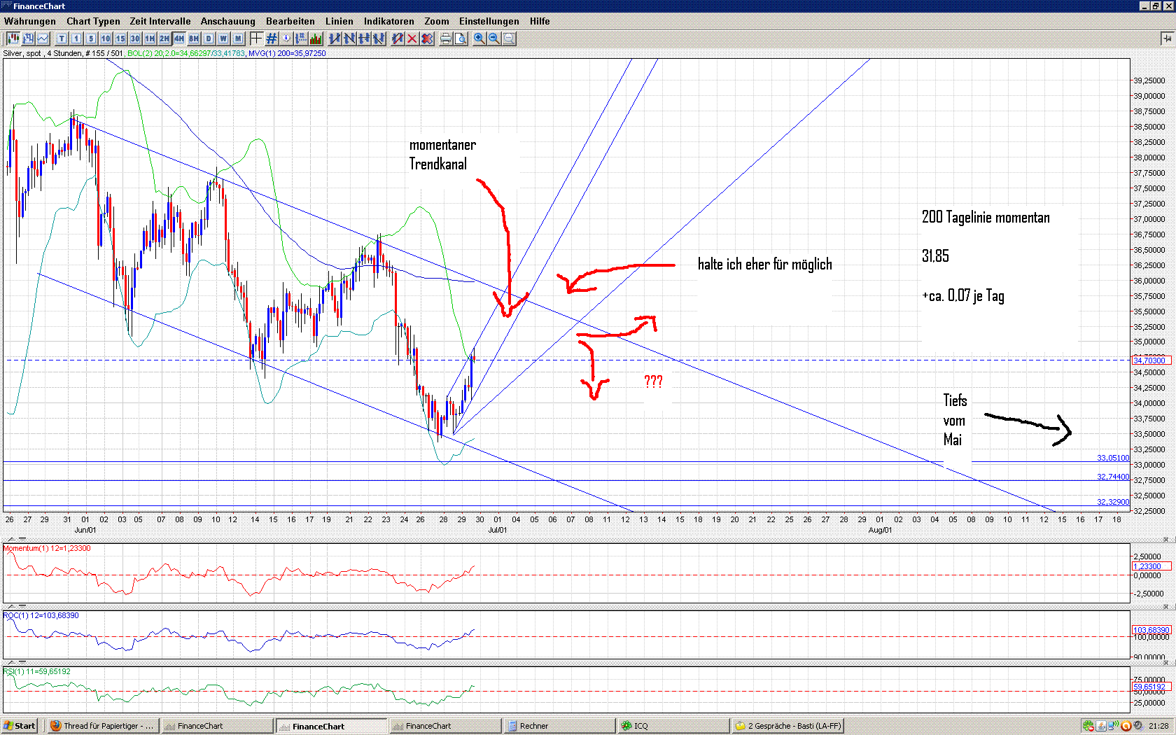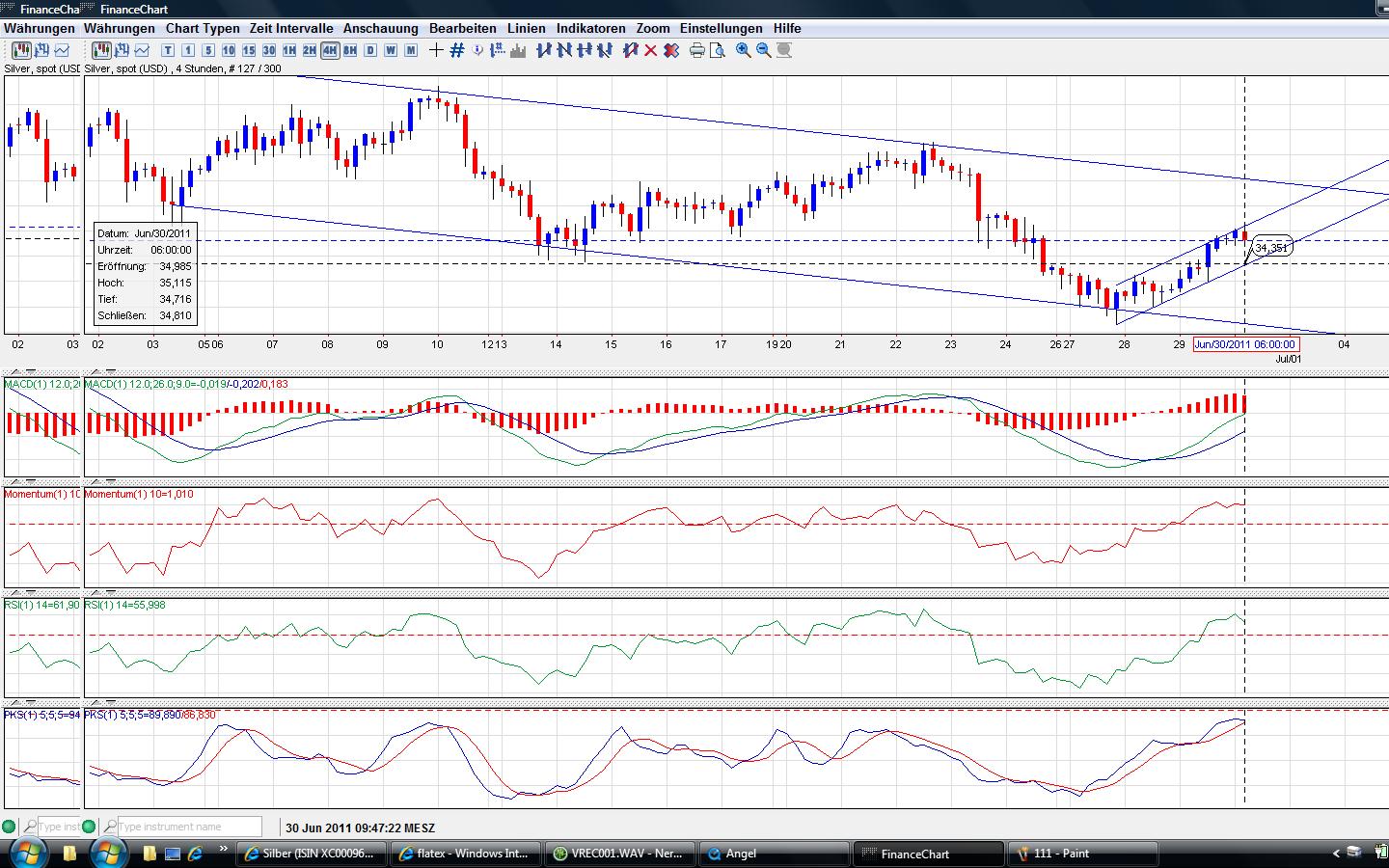 habe aber dabei auch leider schon so richtig in beide richtungen verloren und durch ganz blöde umstände. habe einen put gekauft (wie sich am tagesende herausstellte leider, als er am teuersten war) und als ich mich für einen call entschieden hatte auch diesen und wie sich später herausstellte, pendelte der silberkurs den ganzen tage genau zwischen den beiden hin und her, so dass ich wenn der kurs raufging, hoffte, den einen wenigstens ohne verlust zu verkaufen, was aber immer kurz vorher wieder in die andere richtung ging und selbst da ging es ebenso weiter. fazit war: dies war ein total schwarzer tag - der eine verbrannte und der andere war nur noch mit 1/3 zu retten.