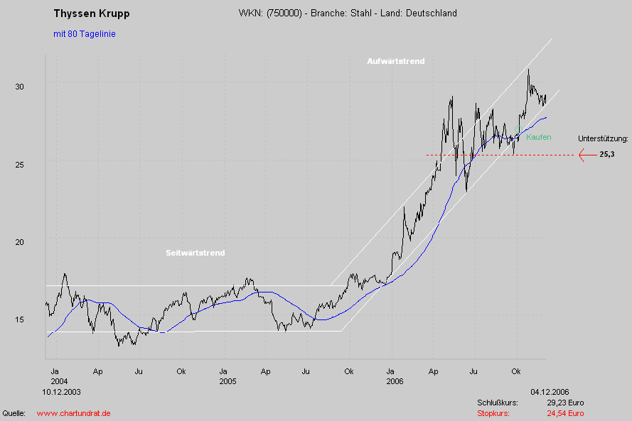 Rückblick: Die THYSSEN KRUPP Aktie erreichte am 12.05.2006 ihr Jahreshoch bei 29,98 Euro. Danach korrigierte die Aktie zunächst bis auf die Unterstützung bei 22,40 Euro. Nach einer kurzen Rallye ging die Aktie in eine Seitwärtsbewegung mit oberer Begrenzung bei 28,80-28,50 Euro über. Diese durchbrach die Aktie am 25.10.2006 und zog sofort auf 31,93 Euro an. Von dort aus fiel die Aktie auf die obere Begrenzung der Seitwärtsbewegung zurück, wo sie in den letzten Tages seitwärts lief. Im heutigen Handel fäll die Aktie aber unter diesen Bereich 28,80-28,50 Euro zurück. Bei 27,74 Euro liegt noch der Aufwärtstrend seit Dezember 2005.