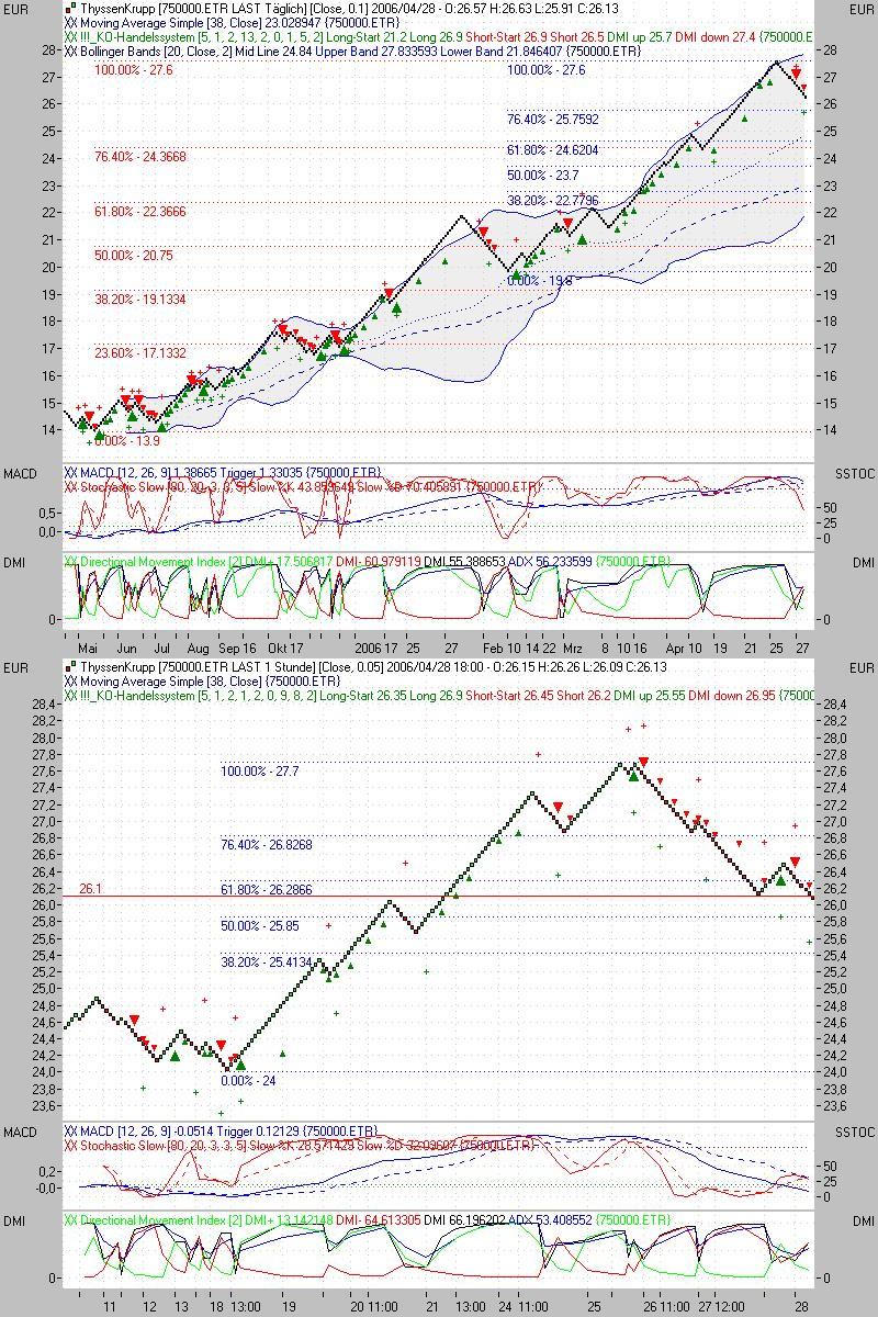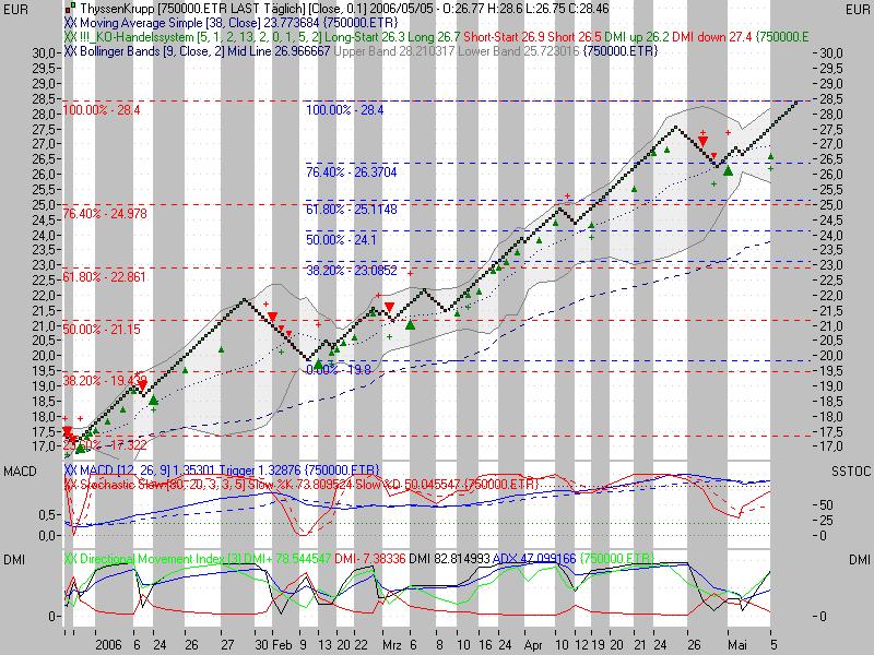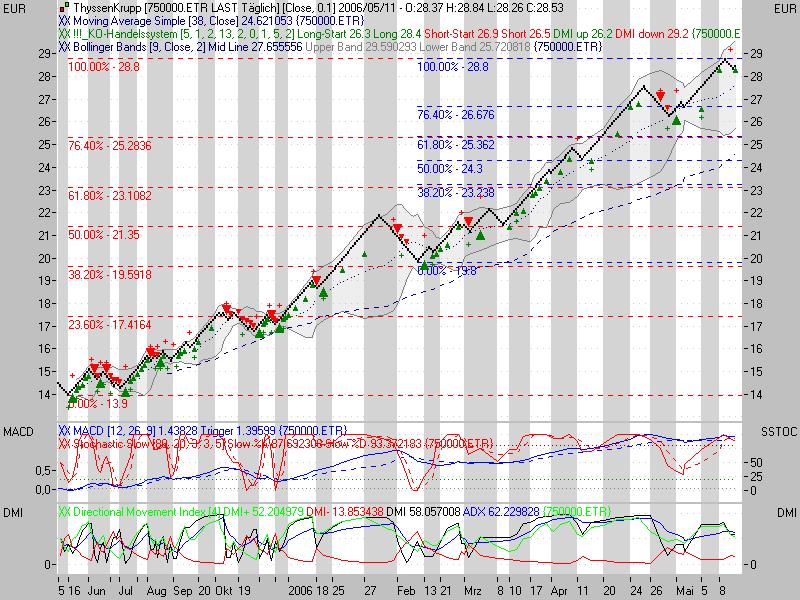 Die Thyssen Krupp Aktie bewegte sich in einem intakten Aufwärtstrendkanal. Aus diesem ist sie signifikant nach unten ausgebrochen, jedoch im weiteren Verlauf (am 06.10.2006) in den Aufwärtstrendkanal eingetreten. Dadurch hat sich das Chartbild wieder verbessert, denn es besteht nun die Hoffnung, dass die Thyssen Krupp Aktie Ihren langfristigen Aufwärtstrend fortsetzt. Erst bei einem weiteren signifikanten Ausbruch aus dem Aufwärtstrendkanal würde sich das Chartbild erneut verschlechtern. Die Kursentwicklung bestätigt somit wieder den bisher aussichtsreichen Chartverlauf. Aus diesem Grund können die Aktien-Positionen wieder unter Beachtung der Indikatorenanalyse aufgebaut werden.