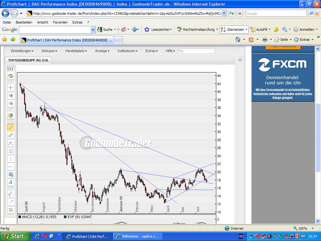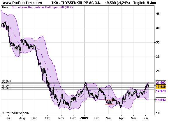Kauf insovern die 21 Euro als SK fällt. Dann wäre nämlich das "W" ausgeformt und ein Trendwechsel fast perfekt, zumindest was den Chart angeht. Thyssen hat 2 schöne Tiefs am SP mit einem Mitteltop dazwischen, sprich eine W-Formation, diese wurde nun, auch dank des Gesamtmarktes, weiter hochgekauft. Auch bei Arcelor und Salzgitter lassen sich ähnlice Formationen finden, bei einem Bruch der 21 Euro wäre charttechnisch Platz bis 23,20 Euro. Ich möchte dabei nochmal betonen das dazu die 21 Euro als SK fallen müssen, sonst könnte ein Abprall mit Trendwechsel entstehen welcher bis 15 Euro laufen könnte. Fundamental sieht es unverändert schlecht aus, deshalb nochmal die Betonung auf Carttechnik! Thyssen war nicht zuletzt dank der W-Formation und den Analystenkommentaren die sich nun mit dem Wind drehen die letzten Tage stabiler als Salzgitter - ein ewiges Wechselspiel. Zumindest sieht es hier charttechnisch so gut aus wie lange nicht mehr, die 20,90 Euro sind der letzte härtere Widerstand, dannach erst wieder die genannten 23,20. Auch wenn ich auf diesem, doch recht teueren Niveau gerade nicht zum Kauf rate sollte man diesen Wert in der Watchlist behalten!