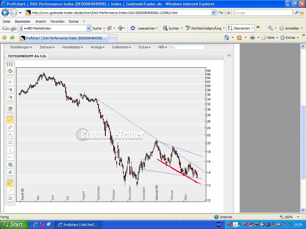 Am 19. März habe ThyssenKrupp einen Verlust für das zweite Fiskalquartal 2009 angekündigt und vor Einmaleffekten einen positiven Vorsteuergewinn im Gesamtjahr in Aussicht gestellt, allerdings nur wenn sich die Nachfrage erhole. Nach einer Senkung der EPS-Schätzungen für 2009 und 2010 von 2,07 auf 0,62 EUR sowie von 3,19 auf 1,79 EUR werde nur noch mit einem Vorsteuergewinn von 408 Mio. EUR (zuvor 1,22 Mrd. EUR) sowie 1,22 Mrd. EUR (zuvor 2,04 Mrd. EUR) gerechnet.