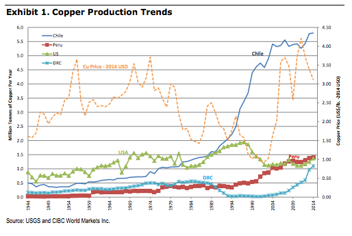 Copper production in the DRC averaged between 6% and 8% of global mine supply from 1994 to 1990, when a mine cave in, political instability then civil war saw production fall to less than 1% of global supply.