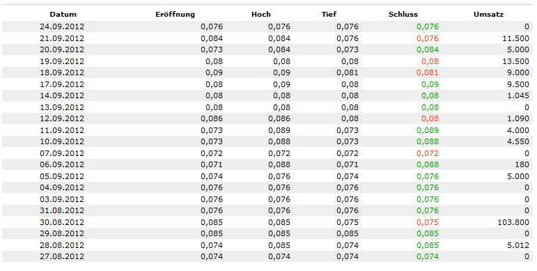 | Datum | Eröffnung | Hoch | Tief | Schluss | Umsatz |