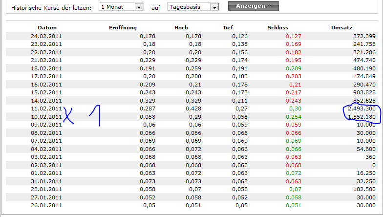 Der Kurs ging aber bereits am 10.02. und am 11.02.2011 ab wie vom Teufel verfolgt und das in einem beachtlichen Volumen !