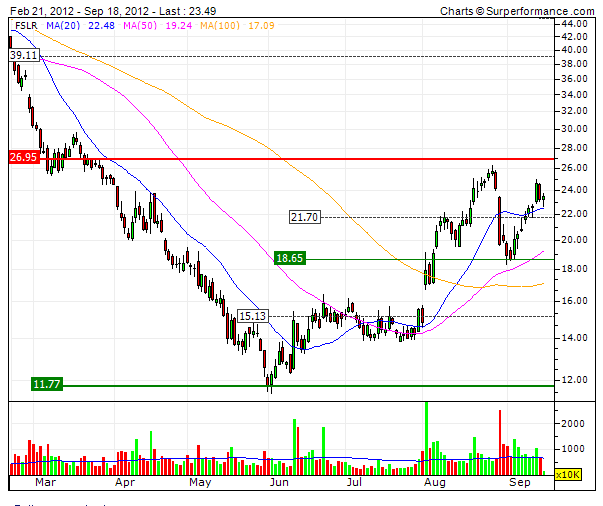 First Solar steigt bis an die ehemalige untere Begrenzung des verlassenen Aufwärtstrendkanals (aktuell ca. 23,60$) um dann wieder zu fallen bis ca. 22,20$.