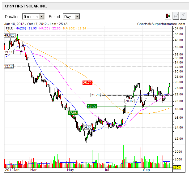 Vor den Zahlen sollten wir uns auf jeden Fall im bereich zwischen 200er Linie und 26$ bewegen. Die Zahlen am 24.10. bringen dann mutmaßlich einen Ausbruch über die 26$ mit Kursen bis zum nächsten deutlichen Widerstand bei 30$ oder ein totales Abschmieren (m.E. eher unwahrscheinlich), wenn die Zahlen enttäuschen.