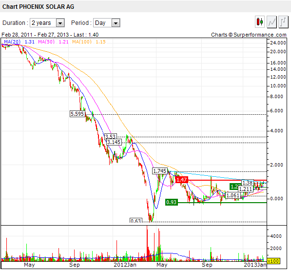 Die Phoenix-Solar-Aktie steckt nach zuvor starken Verlusten seit April 2012 in einer Erholungsbewegung. Einer ersten Aufwärtsstrecke im April und Mai 2012 unter sehr hohem Volumen schloss sich bis Oktober 2012 eine Konsolidierungsbewegung an. Seitdem geht es wieder nach oben. Inzwischen hat die Aktie einen wichtigen Widerstand in Form des EMA200 bei 1,76 Euro erreicht. Schafft sie es, diesen exponentiellen Durchschnitt wieder zurückzuerobern, lässt sich durch die Projektionsmethode a=c, also die Länge der ersten Aufwärtsstrecke im Frühjahr 2012 an das Oktobertief 2012 angetragen, ein Kursziel von 2,20 Euro berechnen. Langfristig wäre bei Etablierung eines neuen, nachhaltigen Aufwärtstrends sogar ein Kursziel von 3,70 Euro und damit eine Kursverdopplung möglich. Unter 1,50 Euro darf der Titel hierfür jetzt allerdings nicht mehr fallen.