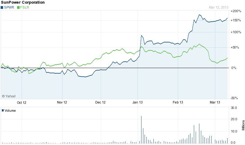 Gestern wurde von Marktforschern vermeldet, dass die Chinesen Ihren Modulabsatz im Januar 2013 gg. den Vormonat um satte 42% gesteigert haben. Das wurde vom Markt mit einer solaren Kursexplosion gefeiert, der auch auf z.B. Enphase und Sunpower übergegriffen hat.