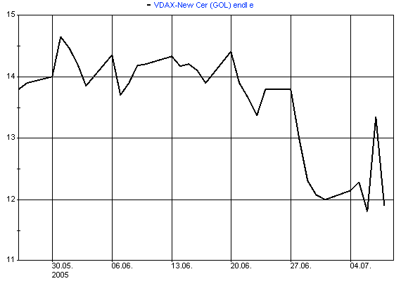 bin nach wie vor überzeugt, daß ein VDAX-Zerti das absolut Richtige ist - steigt der DAX noch weiter wird die Volatilität nicht noch weiter sinken - bei einer Korrektur sind aber Schöne Gewinne im VDAX unvermeidlich - auch in Seitwärtsphasen (August?) mit diversen Auf und Abs steigt die Volatilität und damit das Zerti an ...