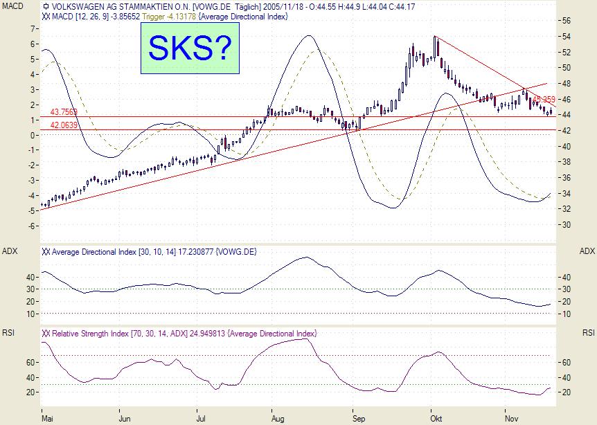 Diagnose: Die AT&S Aktie (Nachrichten) markierte Ende Juni 2000 ihr AllTimeHigh bei 48,50 Euro. Von dort aus fiel sie steil bis auf ein Tief bei 5,80 Euro ab. Bereits im September 2001 setzte aber ein großer Bodenbildungsprozeß ein. Zu diesem Zeitpunkt markierte die Aktie ein Tief bei 9,85 Euro. Nach Ausbildung des Tiefs bei 5,80 im März 2003 zog die Aktie steil bis auf ein Hoch bei 16,80 Euro an und korrigierte im Anschluss bis April 2005 auf ein Tief bei 10,55 Euro. Die komplette Bewegung ab September 2001 ist somit als potenzielle Bodenformation in Form einer inversen und somit bullisch SKS einzuordnen. Im September 2005 brach die Aktie zwar schon einmal kurzzeitig über die Nackenlinie aus, fiel aber dann, nachdem sie das Hoch aus 2004 bei 16,80 Euro nicht überwand, wieder unter die Nackenlinie zurück. In den letzten Wochen bewegt sich die Aktie knapp unterhalb dieser Nackenlinie seitwärts. Aktuell liegt diese wichtige Widerstandslinie bei 15,72 Euro. Bei 21,00 Euro liegt der nächste wichtige Widerstand. Bei 14,32 Euro liegt mit der exp. GDL 50 eine wichtige Unterstützung.