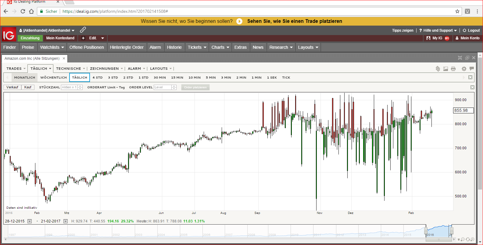 ich schau mir monat, woche, tag und stunde an, hin und her, mit 50/100/200 einheiten zwecks der indikatoren.