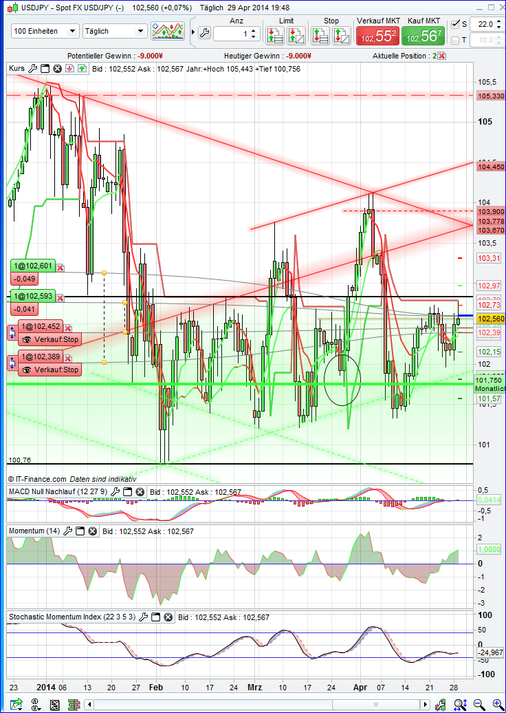 Stelle Dir den 3 Monats-Chart und Jahres-Chart von USD/JPY versus DOW J ein und Du wirst sehen, dass beide weitgehend "parallel" laufen. Sollte USD/JPY kräfig ansteigen, wird auch die 16600 beim DOW geknackt. Allerdings bin ich mir überhaut nicht sicher, ob der USD/JPY noch ansteigt. Wenn man nicht Kurzzeittrader ist, besser abwarten. Morgen wird die FED Tante ihre "Vorhersagen" machen, sollte der DOW morgen steigen? Vorsicht.
