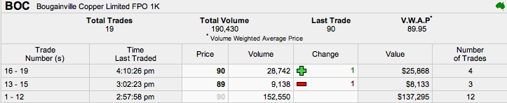 Zu Börsenbeginn steigt jemand mit 152.5 K a 0,90 AUD ein obwohl diverse Paniker ihre Böcke für 0,85 auf den Markt schmeissen wollten. ( bid 141.000 zu 0.90 )
