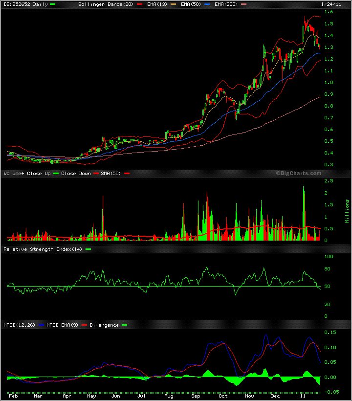 Bisher konnte die Aktie jedesmal an ihrem 50er SMA nach oben drehen - da sich Trendfolgeindikatoren wie der MACD deutlich beruhigt haben, bestehen auch diesmal gute Chancen. Ansonsten wird die 90 Cents bis 1,10 € Region angesteuert - da verläuft der primäre Uptrend auf Tages- und Wochensicht seit März/April 2010: