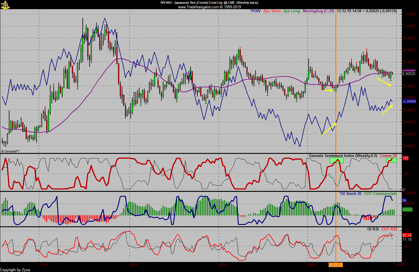 Chart eins zeigt den YEN Future im Weekly mit dem POIV (blau im Chart Fenster)