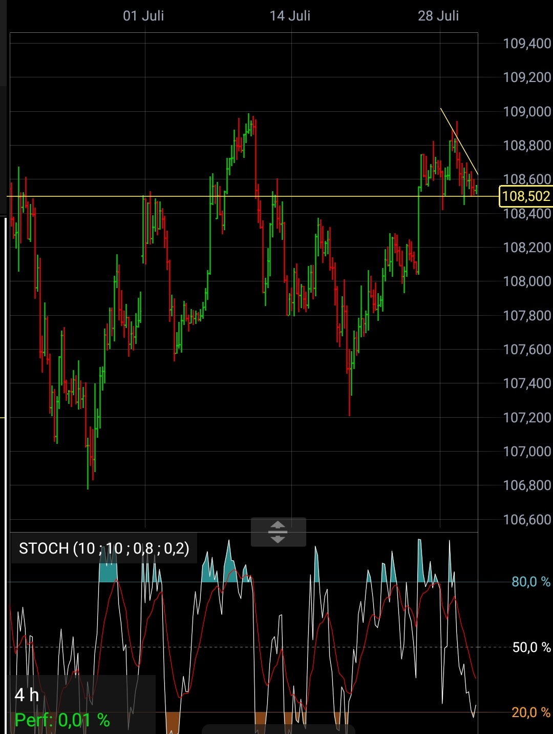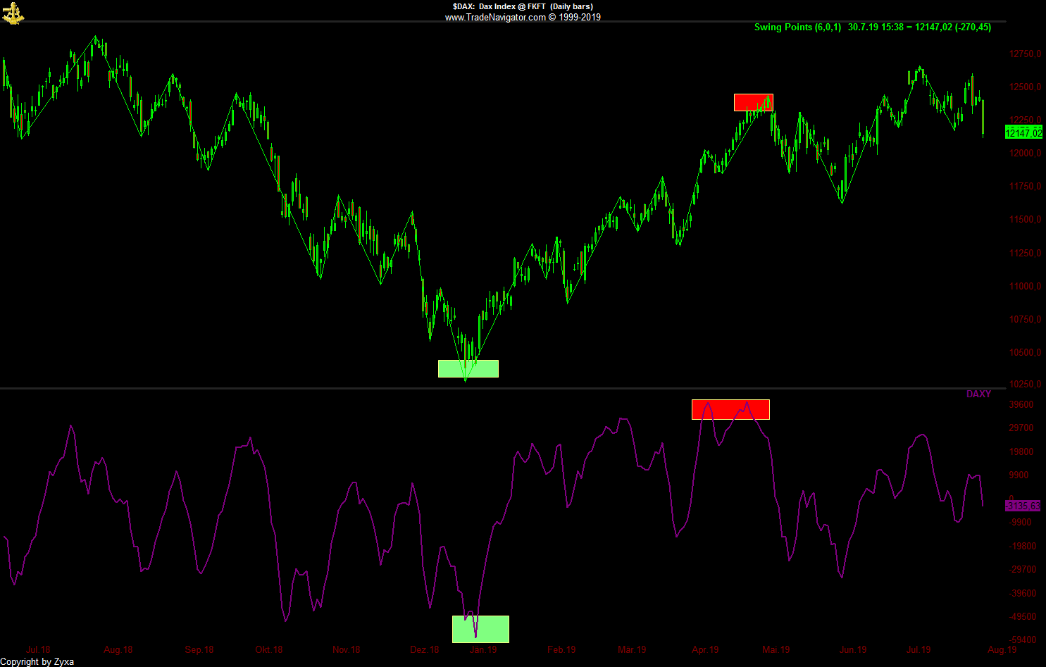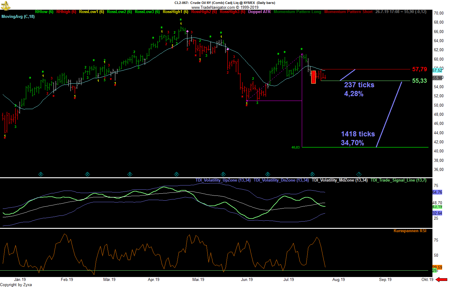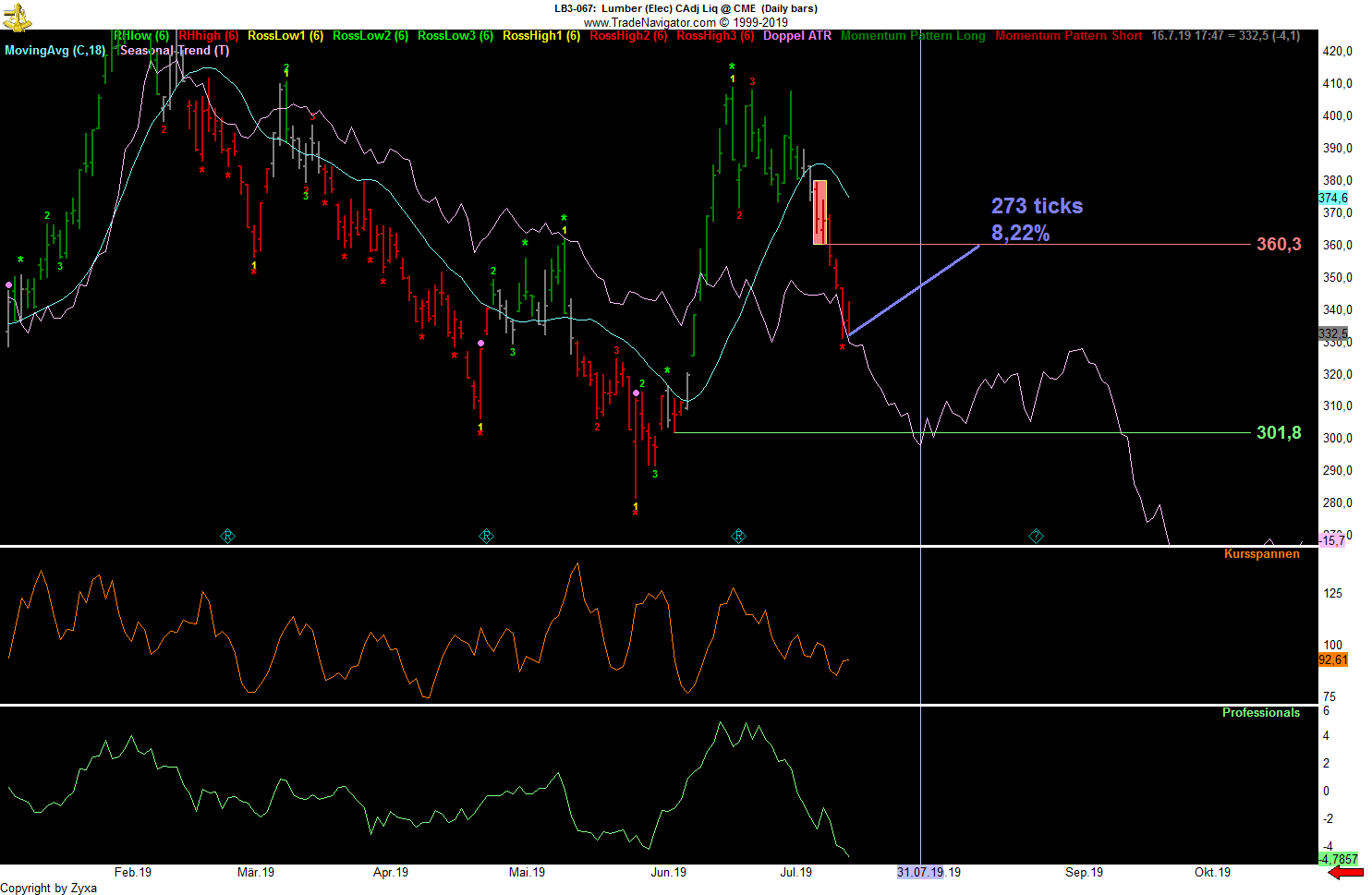 - Die dritte Möglichkeit wäre die, die jetzt am schnellsten zum Erfolg führt, nämlich dass der große Abstand zum SMA52 eine momentan überkaufte Situation anzeigt, die sich irgendwann in nächster Zeit in größerem oder kleinerem Maßstab entlädt, wenn man vom Tageschart ausgeht vielleicht irgendwo in den 7700er-Bereich hinein, wenn man davon ausgeht, dass es noch ein bisschen dauern könnte und die kommende Woche nach dem starken Wochenabschluss erst noch einmal nach oben zeigt, zumindest bis zum Monatsabschluss, vielleicht auch etwas länger ...