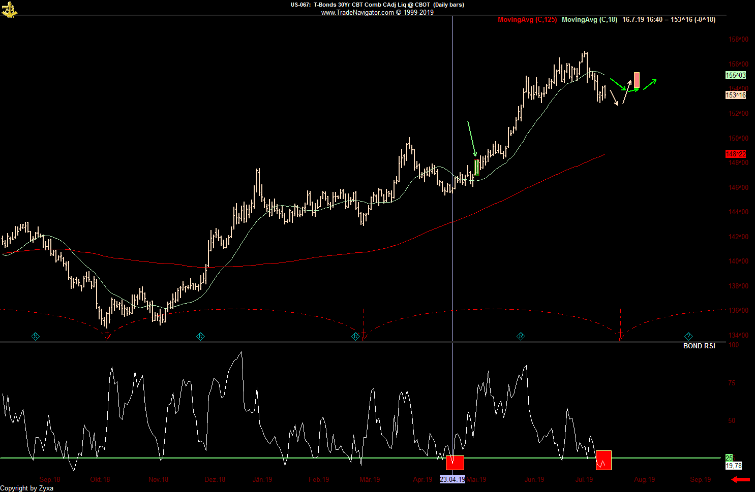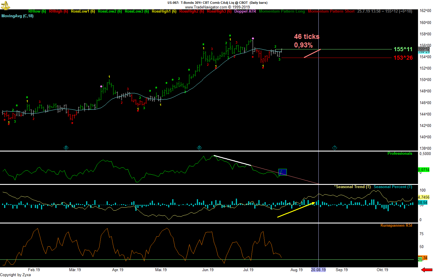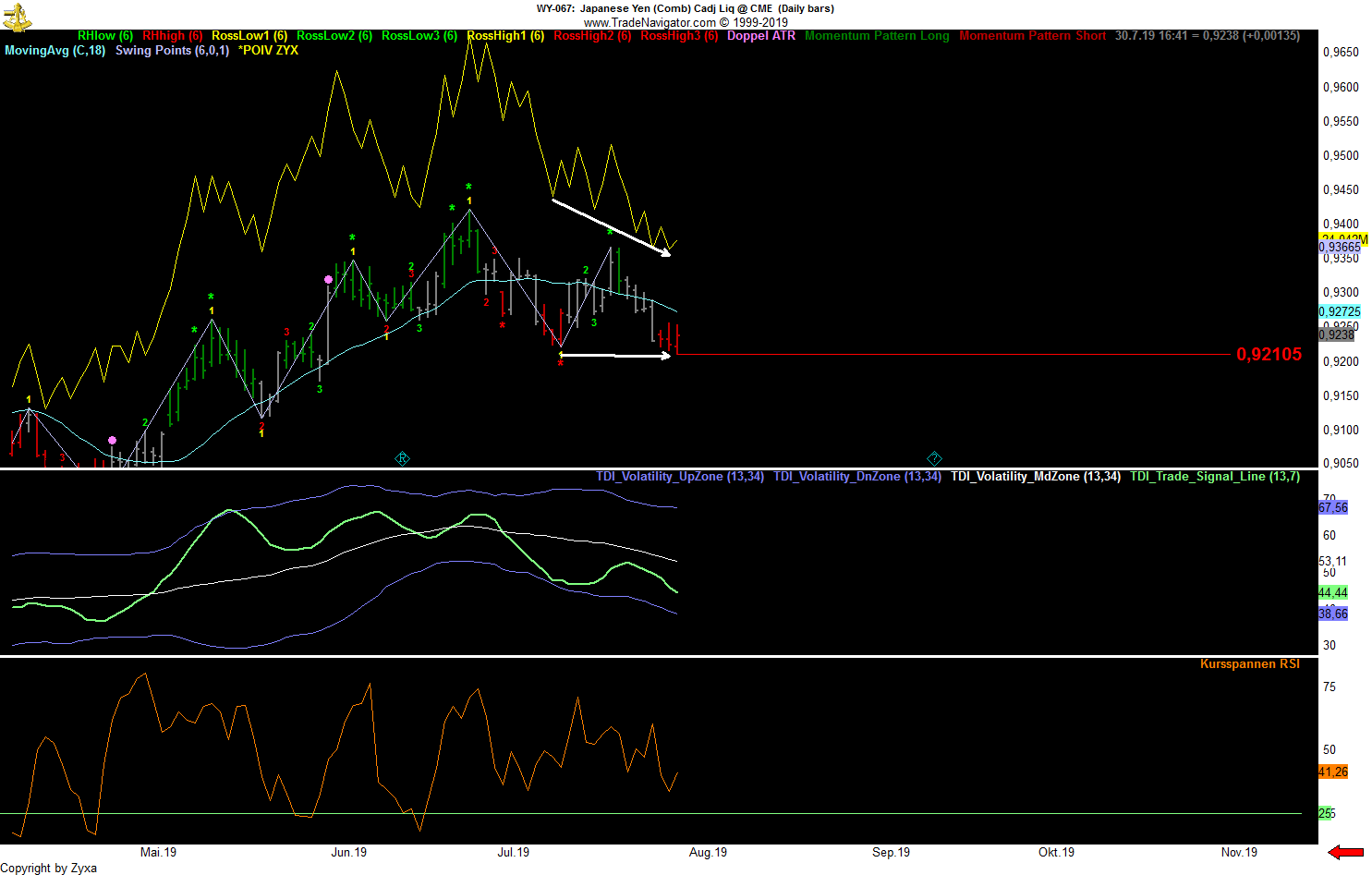 - Die dritte Möglichkeit wäre die, die jetzt am schnellsten zum Erfolg führt, nämlich dass der große Abstand zum SMA52 eine momentan überkaufte Situation anzeigt, die sich irgendwann in nächster Zeit in größerem oder kleinerem Maßstab entlädt, wenn man vom Tageschart ausgeht vielleicht irgendwo in den 7700er-Bereich hinein, wenn man davon ausgeht, dass es noch ein bisschen dauern könnte und die kommende Woche nach dem starken Wochenabschluss erst noch einmal nach oben zeigt, zumindest bis zum Monatsabschluss, vielleicht auch etwas länger ...