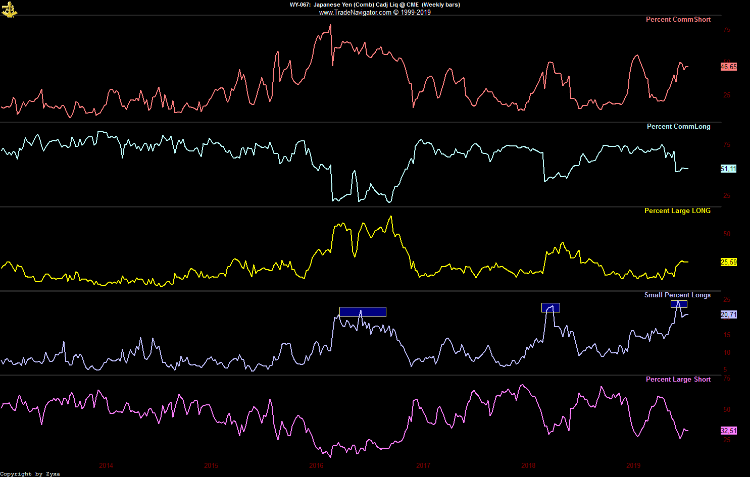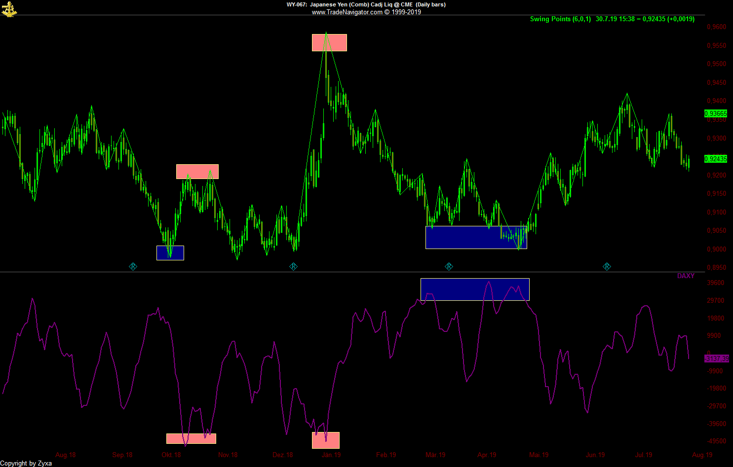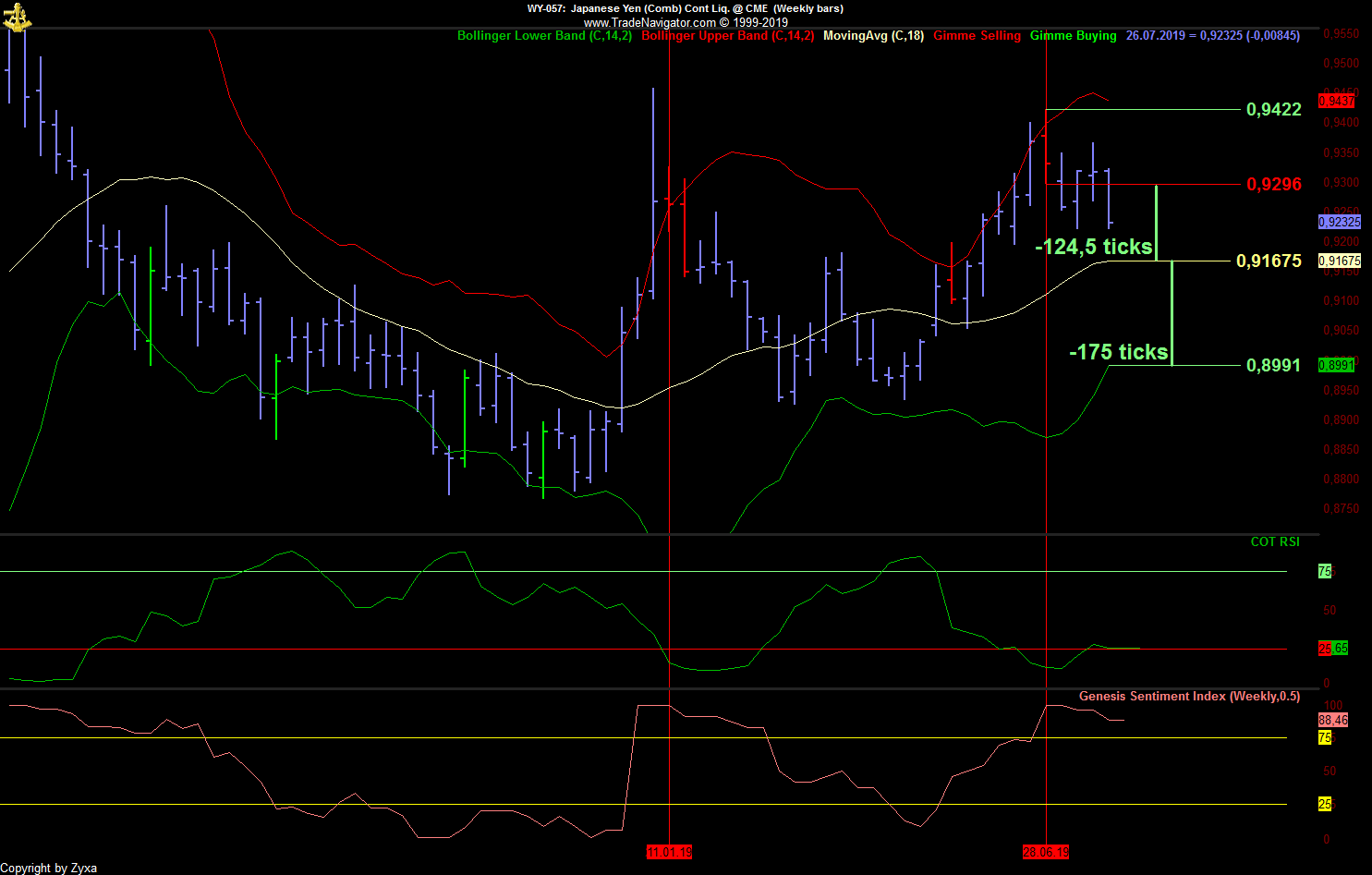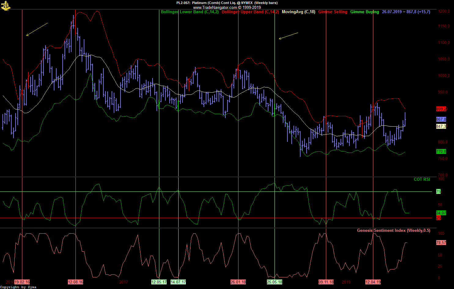- Die dritte Möglichkeit wäre die, die jetzt am schnellsten zum Erfolg führt, nämlich dass der große Abstand zum SMA52 eine momentan überkaufte Situation anzeigt, die sich irgendwann in nächster Zeit in größerem oder kleinerem Maßstab entlädt, wenn man vom Tageschart ausgeht vielleicht irgendwo in den 7700er-Bereich hinein, wenn man davon ausgeht, dass es noch ein bisschen dauern könnte und die kommende Woche nach dem starken Wochenabschluss erst noch einmal nach oben zeigt, zumindest bis zum Monatsabschluss, vielleicht auch etwas länger ...