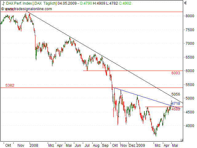 DAX im BIG PICTURE - Neues Rallye-Kursziel bis zu 5.350 Punkte - Der große Bär wird dann (leider) wieder kommen! Datum 17.04.2009 - Uhrzeit 13:51 Angesichts der Kursgewinne der vergangenen Wochen stellt man sich die Frage, wo denn die ganzen Bären geblieben sind. Ausgestorben ? Satt von den Kursverlusten der vergangenen Monate ? Oder aber übermütig in den Hinterhalt der Bullen gelaufen ? DAX aktuell 4.677 Punkte Am 09.03. dieses Jahres markierte der DAX bei 3.588 Punkten sein Tief, um seitdem nahezu durchgehend anzusteigen. Derzeit notiert der Index bei 4.677 Punkten und damit in unmittelbarer Reichweite der entscheidenden deckelnden Widerstandslinie der vergangenen Monate, die jetzt bei 4.800 Punkten verläuft. Im Bereich von 4.800 Punkten bietet es sich zumindest nicht an im DAX neu einkaufen zu gehen. Die Möglichkeit einer Konsolidierung ist gegeben. Die 4.800 Punktemarke würde ich auf der anderen Seite aber auch nicht shorten, also leerverkaufen. Das Risiko ist angesichts des vorliegenden stark positiven Momentums der Bärenmarktrallye zu groß, mit Shortpositionen Verluste einzufahren. Auch auf dem aktuell erhöhten Kursniveau macht es für aktive Anleger noch immer Sinn in zwischengeschaltete kurzfristige Kursrücksetzer die Rallye zu kaufen! Die bisher genannten charttechnischen Kursziele von 4.850 und 5.000 Punkte lassen sich um ein weiteres Maximal-Kursziel erweitern. Angesichts des starken Momentums halte ich es nicht für ausgeschlossen, dass der DAX sogar (maximal) bis 5.350 Punkte durchschießen kann. Bei 5.350 Punkten liegt ein sehr starker Kreuzwiderstand, der sich unter anderem über die dominante Abwärtstrendlinie und eine sehr wichtige horizontale Linie definiert. Ich fasse zusammen. Bärenmarktrallye intakt, zwischengeschaltete Verschnaufpause im Bereich von 4.800 Punkten möglich (aber nicht zwingend!), charttechnische Kursziele bei 4.800, 5.000 und maximal bei 5.350 Punkten. Gefahr einer anschließenden größeren fortgesetzten Korrekturphase nach wie vor hoch. Insofern ist Timing im mittelfristigen Zeitfenster das A und O. Herzliche Grüße, Ihr Harald Weygand - Head of Trading bei GodmodeTrader.de Kursverlauf (oben) seit 1999 (Linienchart als Übersichtsdarstellung) Kursverlauf (unten) seit September 2008 (log. Kerzendarstellung / 1 Kerze = 1 Tag) DAX im BIG PICTURE - Das macht richtiggehend Freude - Ziel 4.850 und 5.000 Punkte Datum 27.03.2009 - Uhrzeit 06:00 Die Kursnotierungen im DAX steigen, die Nachrichtenlage hellt sich dementsprechend auf, immer mehr Marktbeobachter beginnen auf die bullische Seite zu wechseln. DAX aktuell 4.259 Punkte. Diese kurze Kommentierung bezieht sich auf die ausführlichen Vorgängerkommentierungen, die unten als Kopie angehängt sind. Charttechnische Kursziele für die laufende Bärenmarktrallye liegen bei 4.500-4.550 Punkten und anschließend bei 4.850 Punkten. Laut den Elliotwellen sind auch bis zu 5.000 Punkten möglich. Beachten Sie, dass alles relativ ist. Wir werten die laufende Kurserholung (allerdings eine erhebliche Erholung) als Bärenmarktrallye; also als eine Erholung im Rahmen des übergeordneten nach wie vor intakten Abwärtstrends seit 2008. Dieser Hinweis soll nicht abschrecken, lediglich ins Gedächtnis rufen, in welchem Markt wir uns bewegen. Mittelfristige Aufwärtstrendphasen wechseln sich mit mittelfristigen Abwärtstrendphasen ab. Insofern ist beim Handeln das Timing A und O. Und wieder einmal macht der Markt nicht das, was viele erwartet haben. So wie es aussieht, setzt er nicht mehr deutlich zurück. Dennoch kann festgehalten werden, dass der DAX bei 4.500-4.550 Punkten zunächst nach unten abprallen und zwischenkonsolidieren kann. DAX im BIG PICTURE - Startschuß für umfassende Bärenmarktrallye ist gefallen! Datum 12.03.2009 - Uhrzeit 00:00 Es gilt jedoch den einen oder anderen nochmaligen Kursrücksetzer einzukalkulieren. Wenn uns etwas der Markt der vergangenen Monate gelehrt hat, dann das, dass es grob fahrlässig ist mit zu hohem Kapitaleinsatz mit zu hohem Hebel in den Markt zu gehen. An erster Stelle sollte der Kapitalerhalt stehen, an zweiter Stelle das berechtigte Streben nach Profit. Halten Sie sich daran! DAX aktuell 3.914 Punkte. Durch den Bruch der zentralen Unterstützung bei 4.000 Punkten wurde ein Verkaufssignal mit Kurszielen von 3.650 und 3.500 Punkten ausgelöst. Das bisherige Korrekturtief liegt bei 3.588 Punkten. Die 3.500er Marke wurde also nicht mehr erreicht. In der unteren Chartgrafik sehen Sie recht eindrucksvoll, dass der DAX auf die projezierten Trendkanalunterkante des Kursgeschehens seit Oktober 2008 nach oben abgeprallt ist. Bei 4.100 Punkten wartet nun als entscheidender Widerstand die Unterkante des ehemaligen ebenfalls seit Oktober skizzierbaren symmetrischen Dreiecks. Die Intermarketauswertungen, - beispielsweise die Vorgaben von DOW Jones und Nasdaq100 -, lassen für den DAX ganz klar die Prognose zu, dass mit hoher Wahrscheinlichkeit ein Rebreak über 4.100 Punkte gelingen dürfte. Ein solches Rebreak wiederum wäre als starker temporäres Kaufsignal auf mittelfristige Sicht zu werten. Bereits in der vorhergehenden Chartkommentierung vom DAX wurde auf dieses Scenario hingewiesen. Es kommt nun tatsächlich so. Steigt der DAX über 4.100 Punkte, generiert dies umgehend ein Kaufsignal mit Kursziel 4.500-4.550 Punkte. Dort verläuft der exp. GDL 100 (EMA100); im Chart gelb markiert. Der DAX orientiert sich im mittelfristigen Zeitfenster sehr genau an diesem Durchschnitt. Anschließend wartet bei ca. 4.850 Punkten die allesentscheinde mittelfristige Widerstandslinie seit Oktober 2008. Fast alle markanten Hochpunkte seit Oktober 2008 liegen genau auf dieser Trendlinie. Sie hat also Relevanz. Die Marktteilnehmer sind auf eben diese Trendlinie psychisch konditioniert. Für die Bullen ist diese Trendlinie soetwas wie eine heiße Herdplatte, auf die sie schon mehrfach draufgefaßt haben. Zusammenfassend die Prognose auf Sicht einiger Wochen und Monate. In dieser Woche dür
